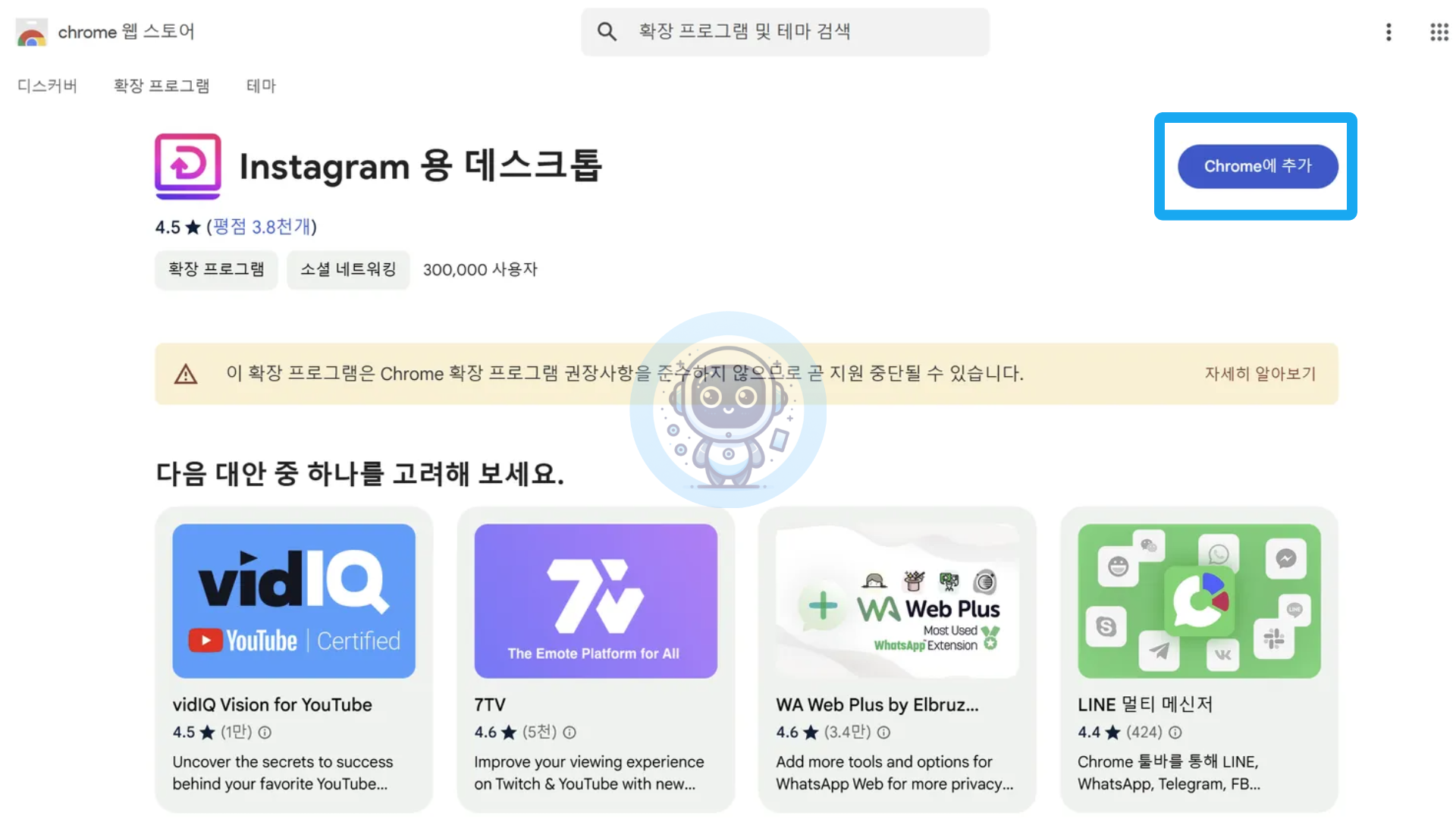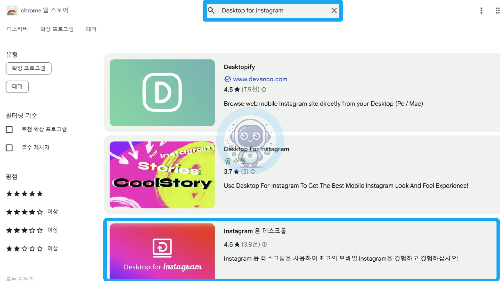 웹 스토어 검색창에 "Desktop for Instagram"을 입력하세요.