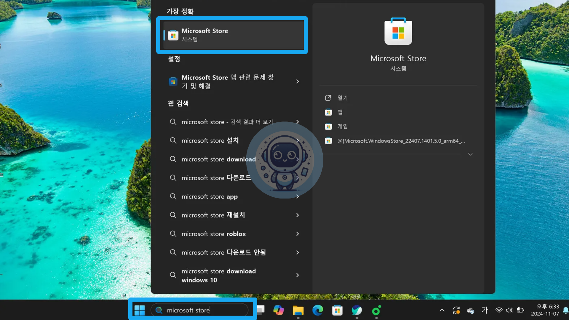 작업표시줄 검색창에 Microsoft Store를 입력하고 검색 결과에서 앱을 실행하세요. 또는 Microsoft Store 홈페이지에서 편하게 다운로드 받으셔도 됩니다.