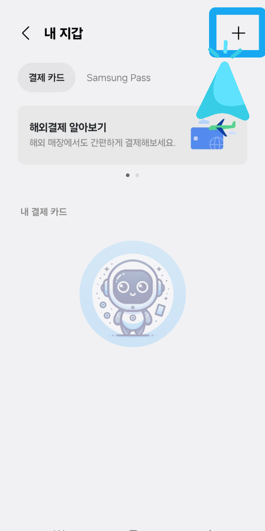 앱의 메인 화면에서 [결제카드]를 클릭하고, 화면 상단에 위치한 [+] 버튼을 눌러주세요.