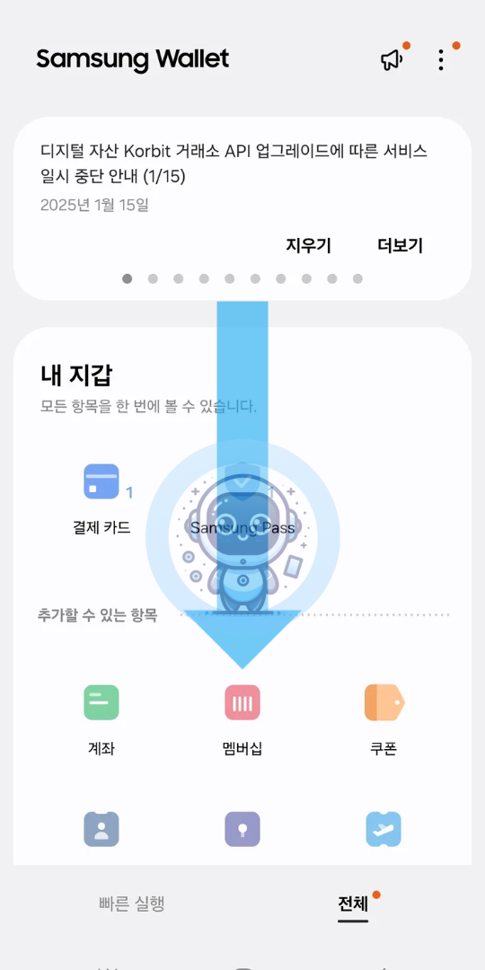 스마트폰에서 Samsung Wallet 앱을 실행하세요. 만약 앱이 설치되어 있지 않다면, 구글 플레이스토어나 갤럭시 스토어에서 다운로드할 수 있습니다.