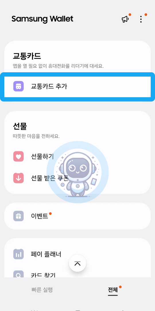 Samsung Wallet 앱의 메뉴에서 [교통카드 추가]를 찾아 선택합니다. 해당 메뉴는 화면을 아래로 스크롤하면 쉽게 찾을 수 있습니다.