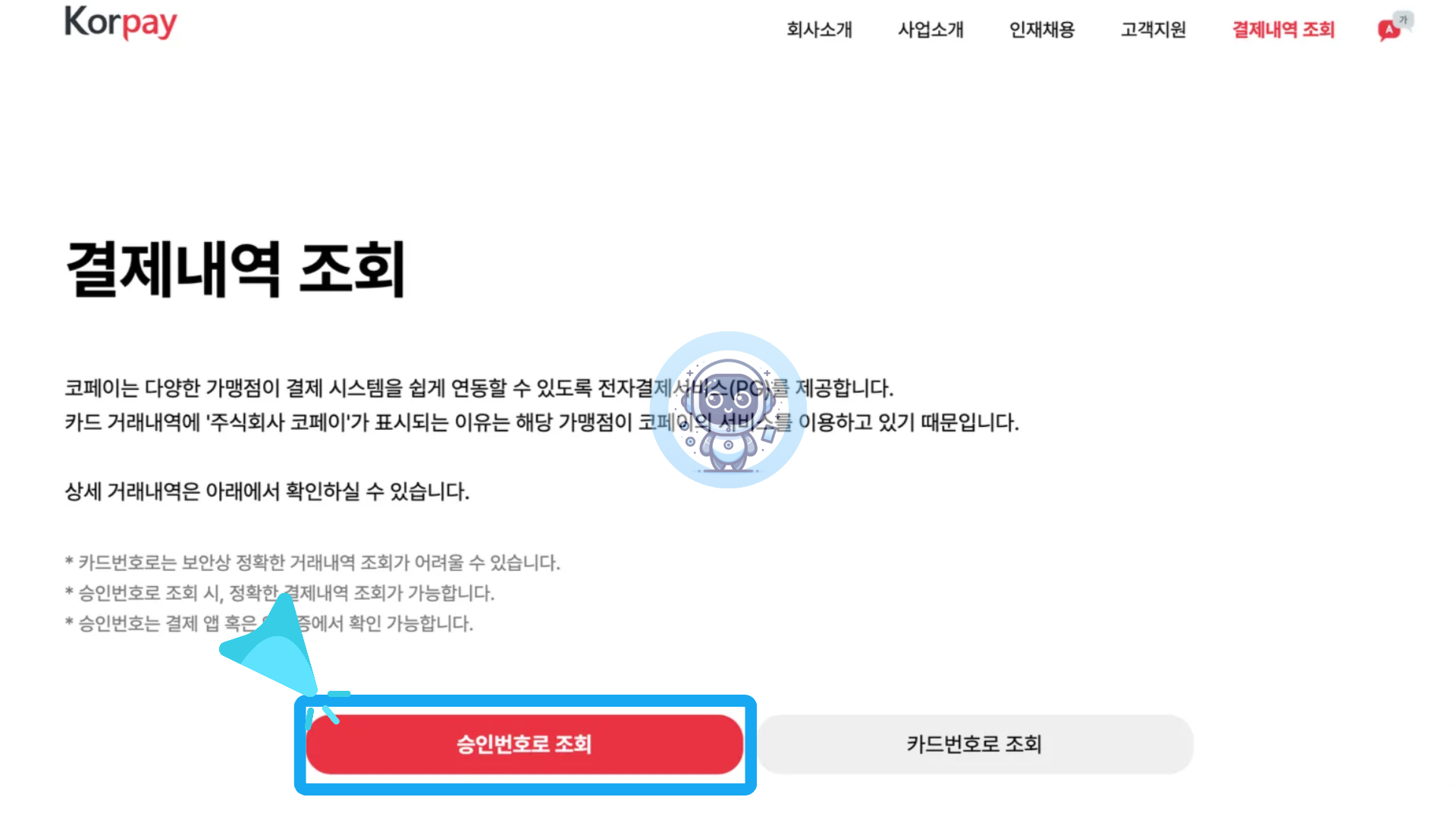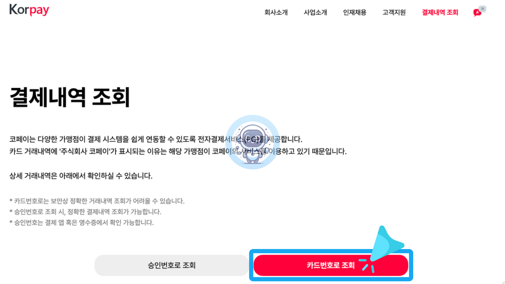 코페이 홈페이지에서 결제내역을 조회하려면 승인번호, 거래일자, 금액 또는 카드번호가 필요합니다. 정확한 정보를 입력해야 조회가 가능합니다.