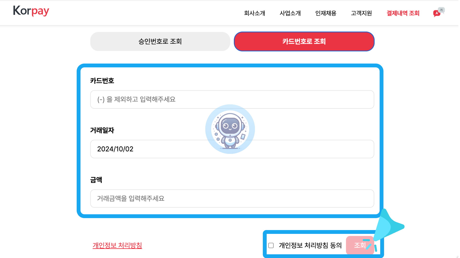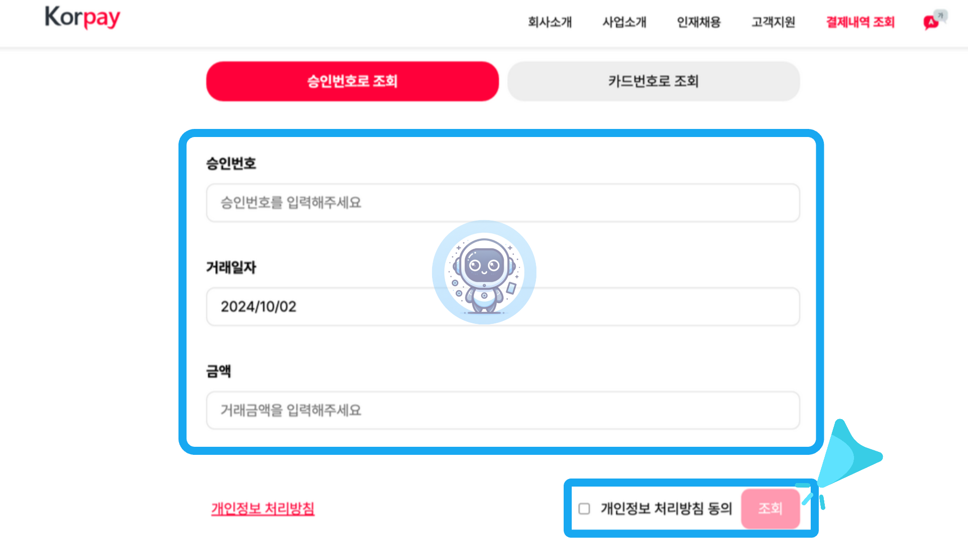 아래로 스크롤 했다면 다음과 같은 화면이 나옵니다. 그럼 먼저 승인번호, 거래일자, 금액을 입력 후 개인정보 처리방침 동의에 체크 후 "조회" 버튼을 클릭합니다.
