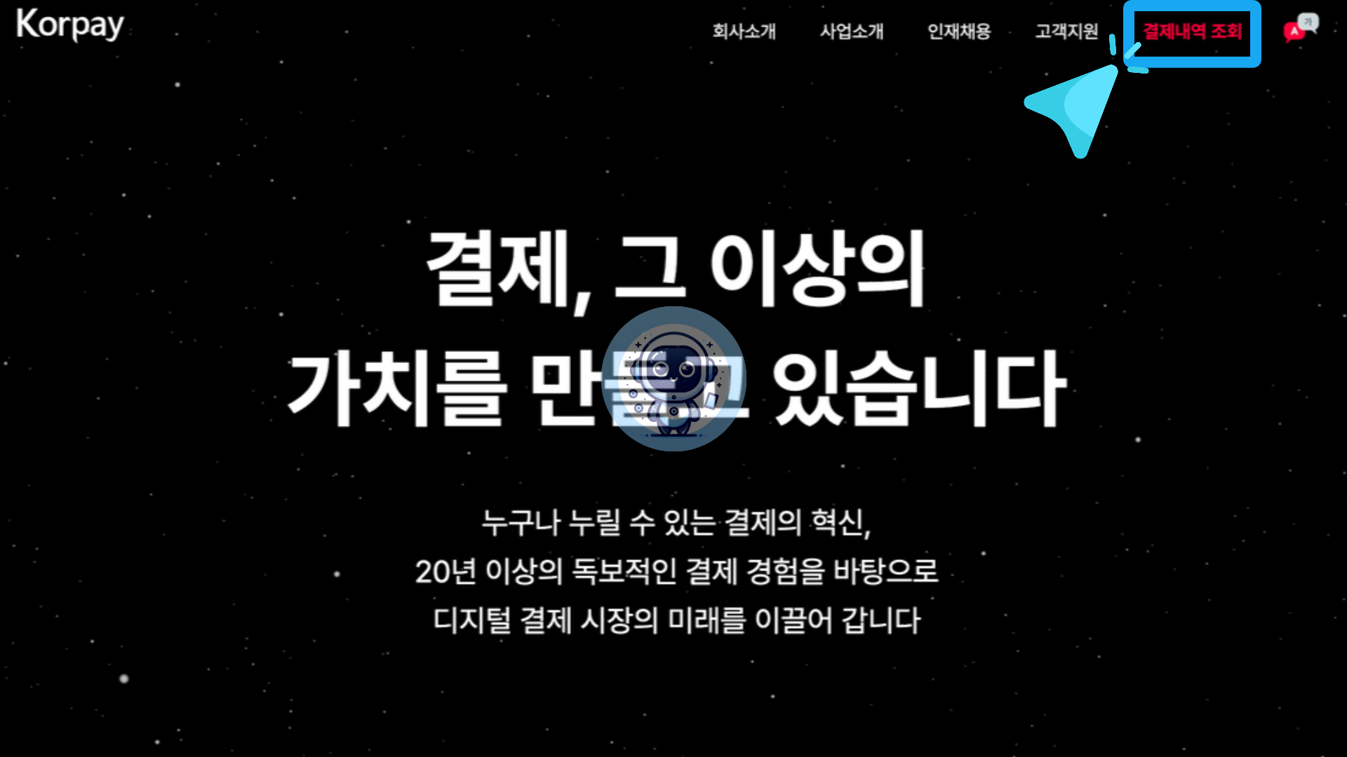 먼저 코페이 홈페이지에 접속한 후, 상단에 "결제내역 조회" 카테고리를 선택합니다.