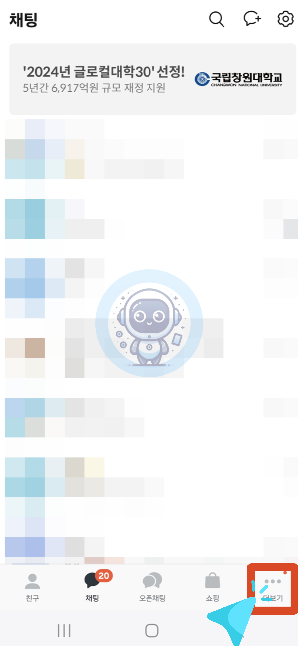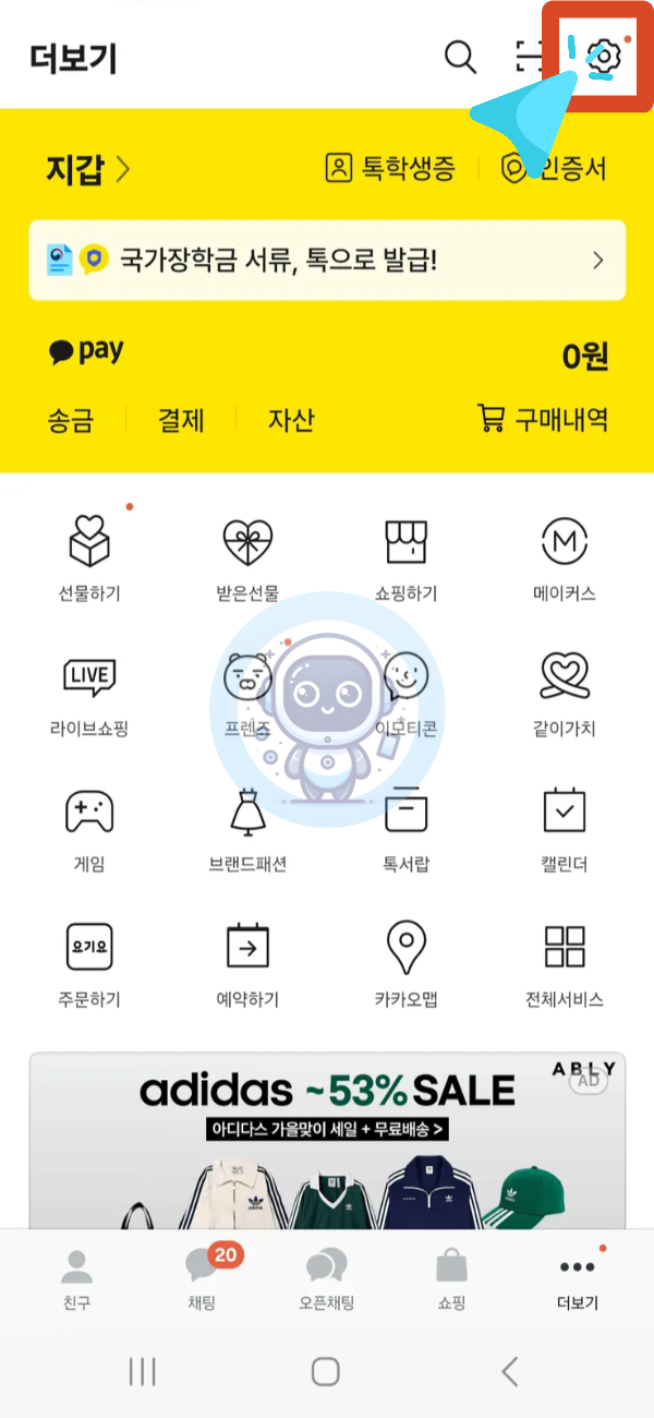 먼저 카카오톡을 실행해요. 메인 화면에서 우측 하단에 있는 "더보기 (...)" 버튼을 눌러주세요. 그리고 우측 상단에 있는 설정 버튼(톱니바퀴 )을 클릭해요.