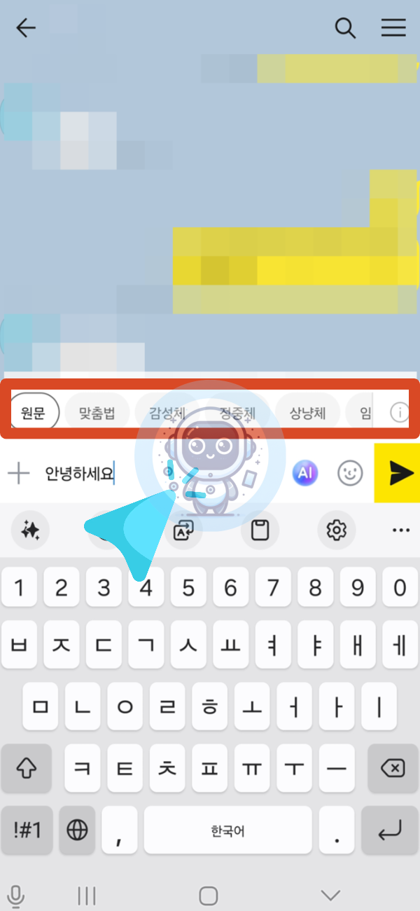 이제 설정이 끝났다면, 카톡 창에 들어가서 원하는 메시지를 입력해요. 입력 후 우측에 있는 AI 버튼을 클릭하면, 다양한 말투로 고칠 수 있는 옵션이 나타나요. 여기서 원하는 말투를 선택해 메시지를 변환해 보세요.