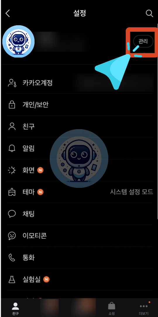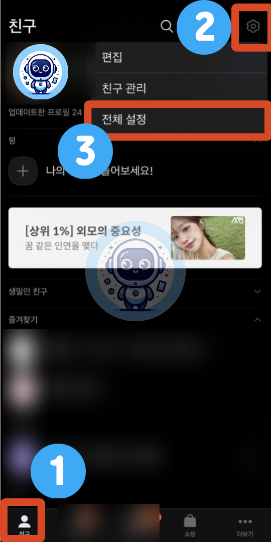먼저, 카카오톡 앱을 열고 친구 목록 화면 상단에 있는 설정 아이콘(톱니바퀴 모양)을 클릭한 뒤, 전체 설정 메뉴로 이동합니다.