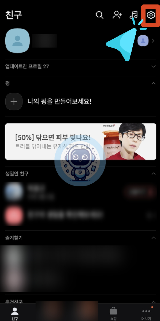 휴대폰에서 카카오톡 앱을 실행 후 친구 탭에서 우측 상단에 위치한 톱니바퀴 모양의 설정 버튼을 클릭합니다.