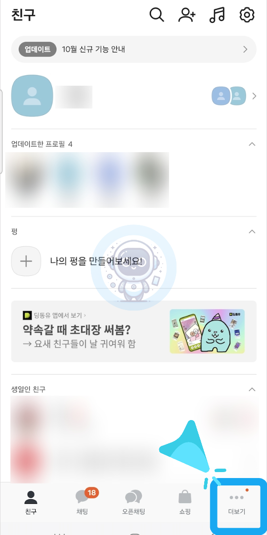 - 카카오톡 앱을 실행하고 '더 보기' 메뉴로 이동합니다.