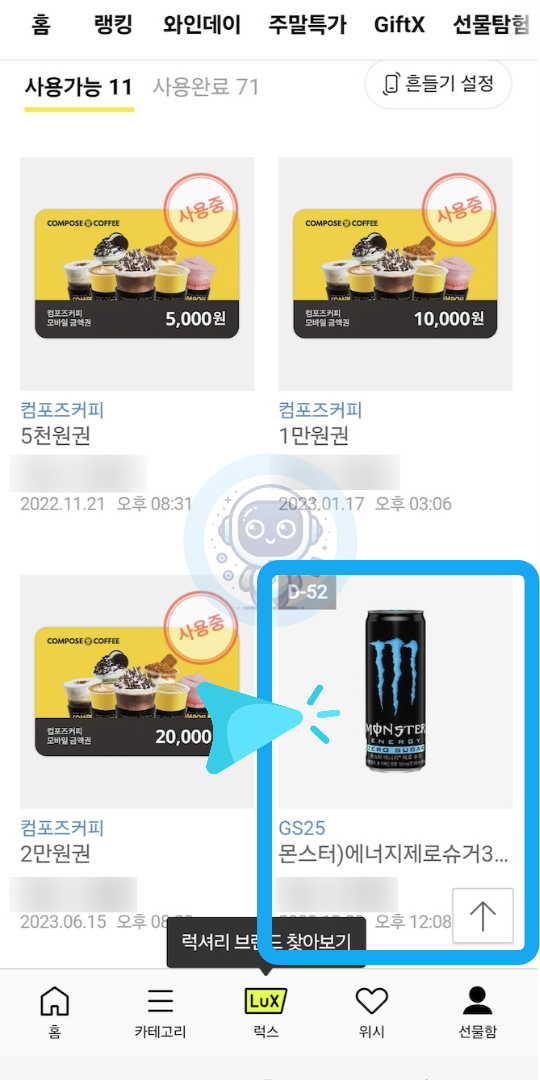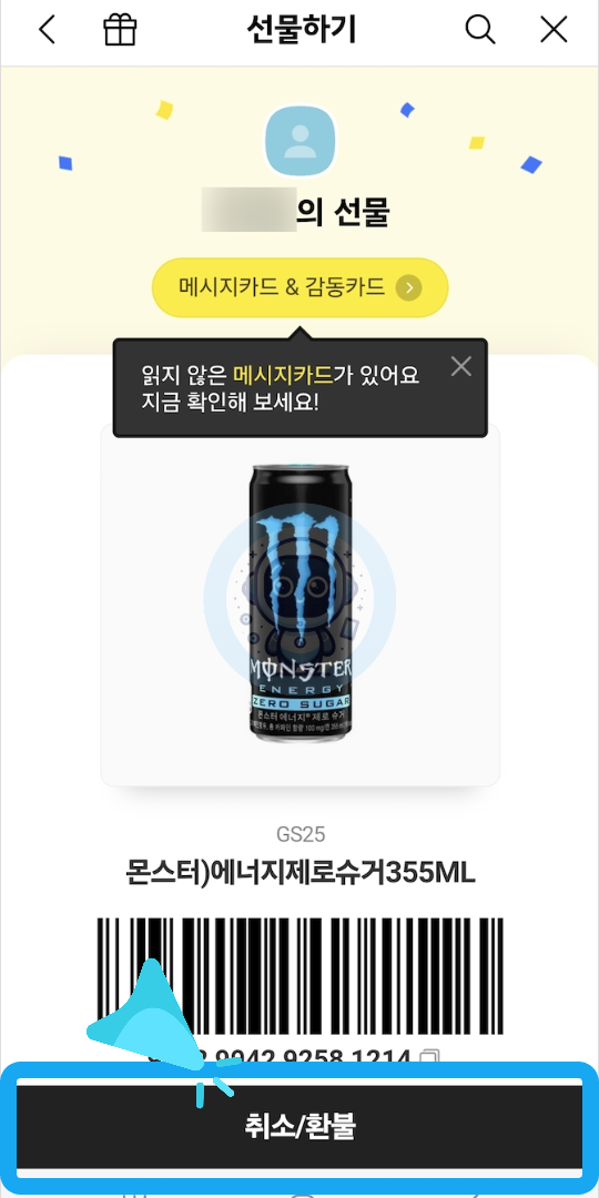'받은 선물' 항목을 찾아 클릭 후 환불 요청하고 싶은 선물을 선택합니다. 필자는 몬스터 에너지 제로 슈거를 환불해 보겠습니다.