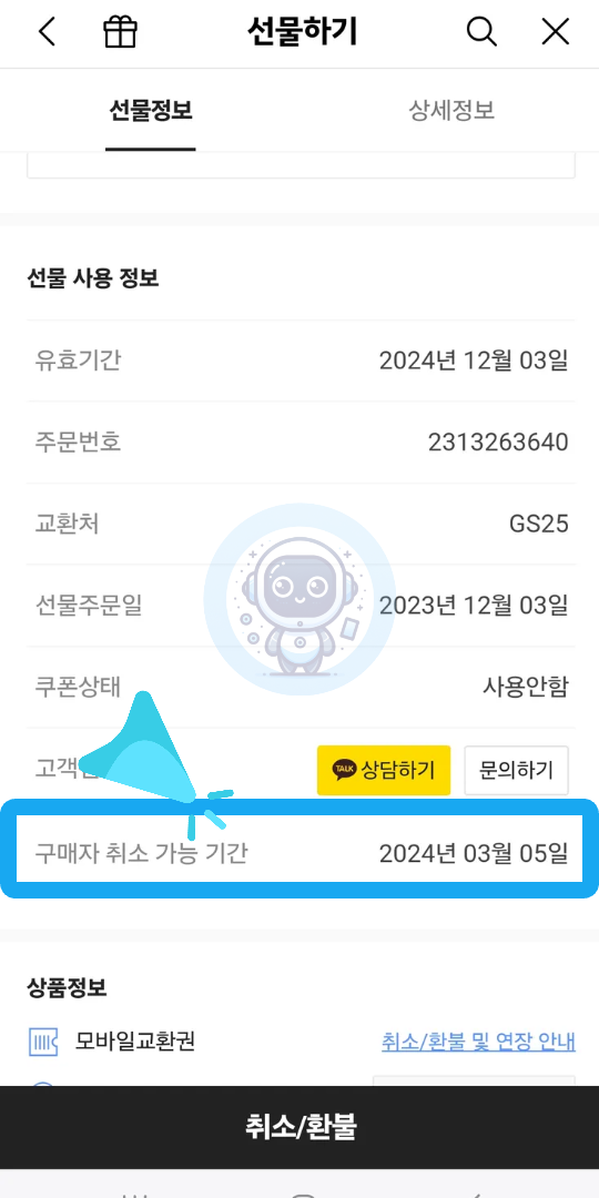 - 구매자와의 동의 여부: 일반적으로 구매자는 환불을 요청할 수 있으나, 받은 사람은 구매자 취소 가능 기간이 지나야 환불을 요청할 수 있다는 점 참고하시기 바랍니다.