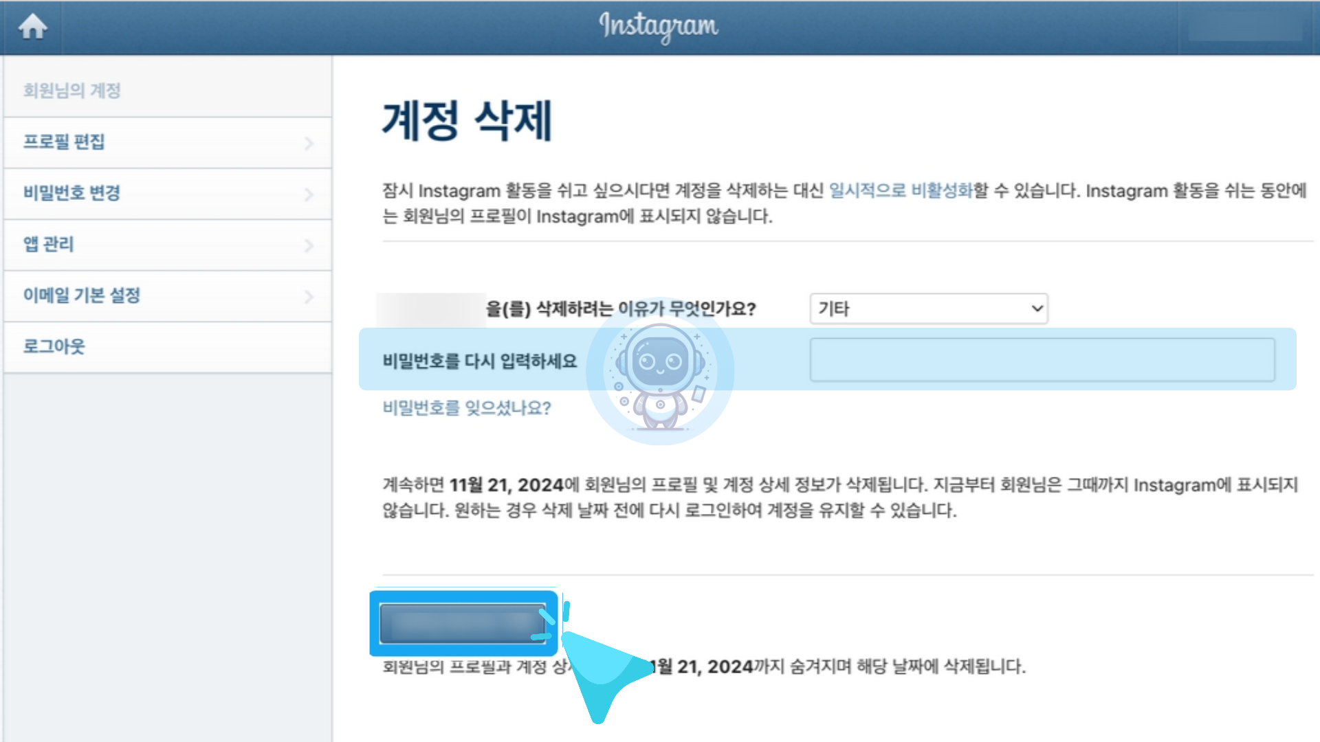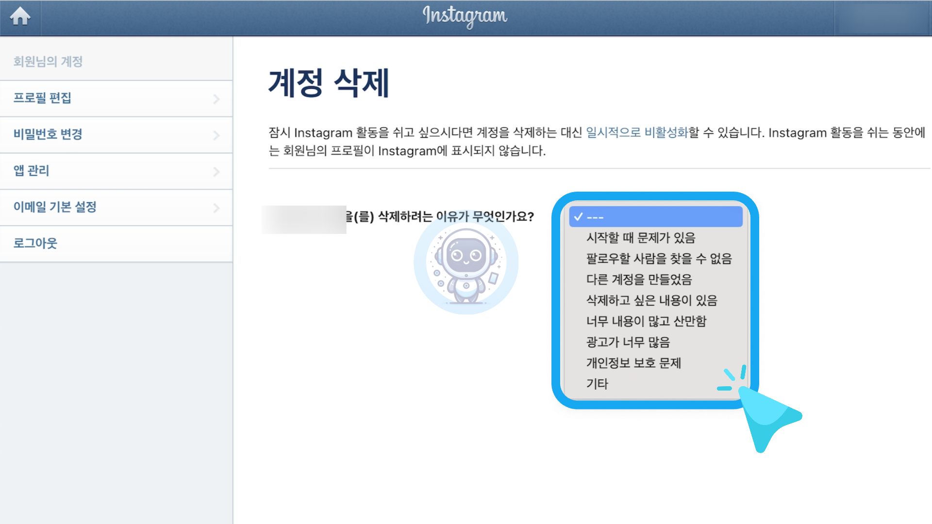 계정 삭제는 웹 페이지에서만 가능합니다. 모바일 앱에서는 계정을 일시적으로 비활성화할 수 있지만, 영구 삭제는 웹 브라우저를 통해 진행해야 합니다.