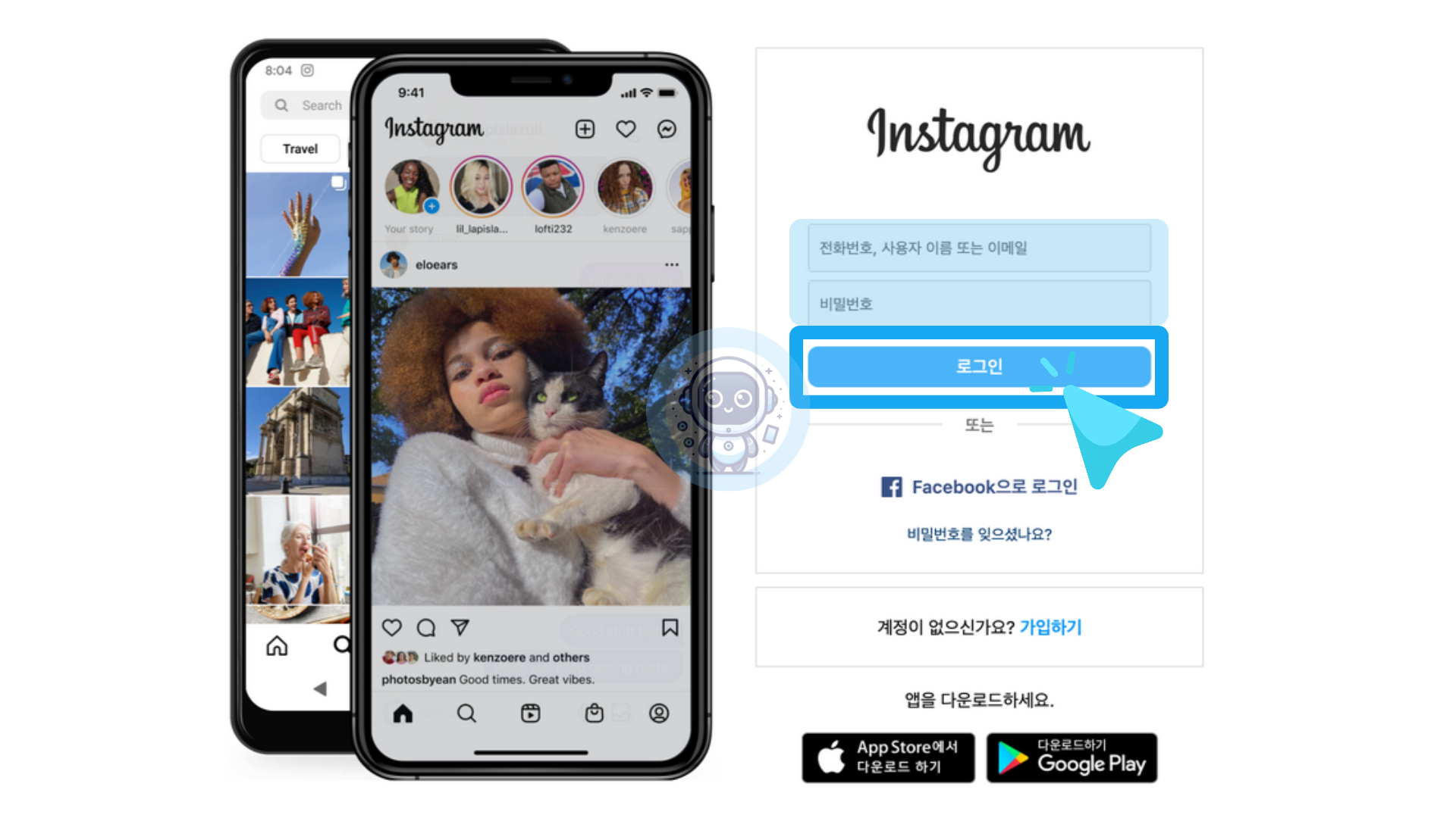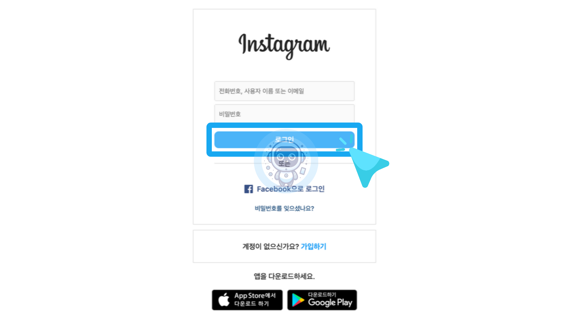 인스타그램 웹 페이지 또는 앱에 들어가 아이디와 비밀번호를 입력 후 [로그인] 버튼을 클릭합니다.