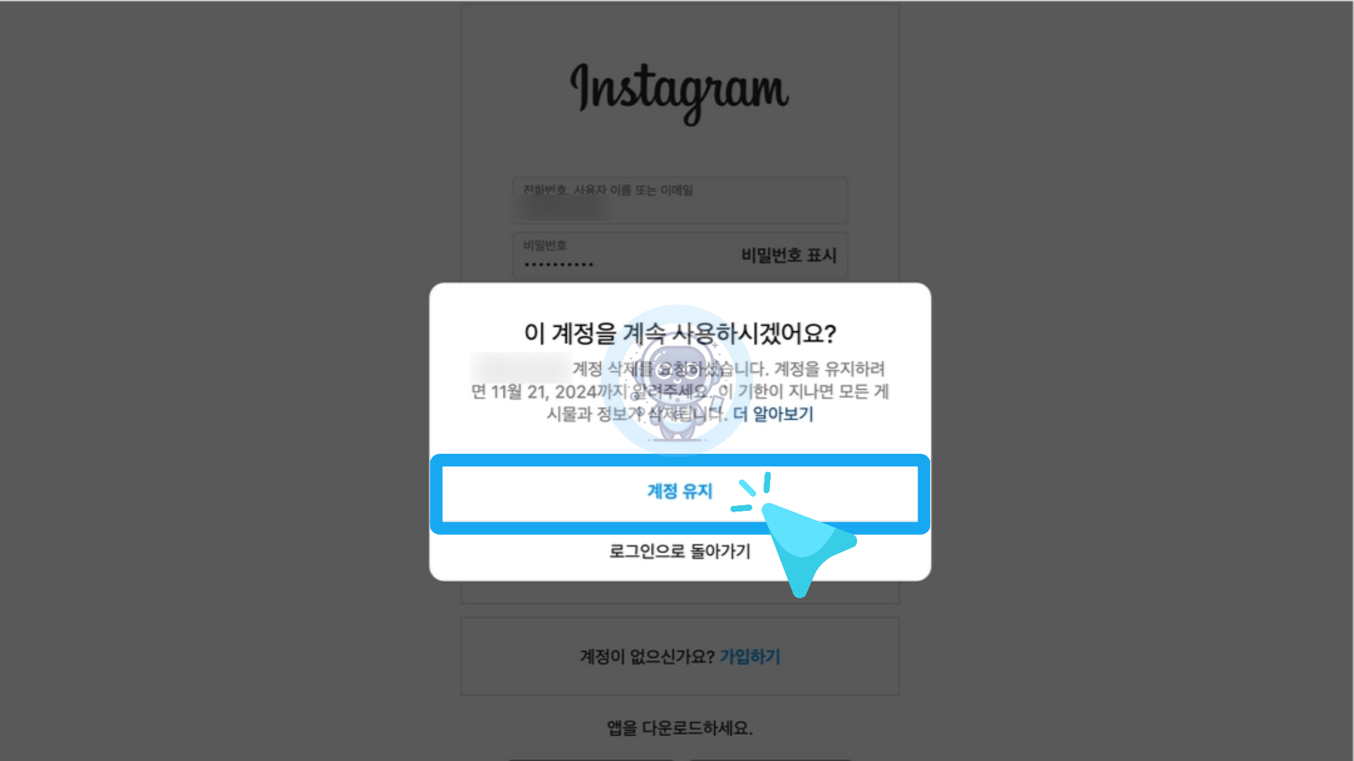 "OOO 계정 삭제를 요청하셨습니다. 계정을 유지하려면 OO월 OO일 OOOO년까지 알려주세요. 이 기한이 지나면 모든 게시물과 정보가 삭제됩니다." 라는 문구가 적혀 있는 팝업 창이 나옵니다.