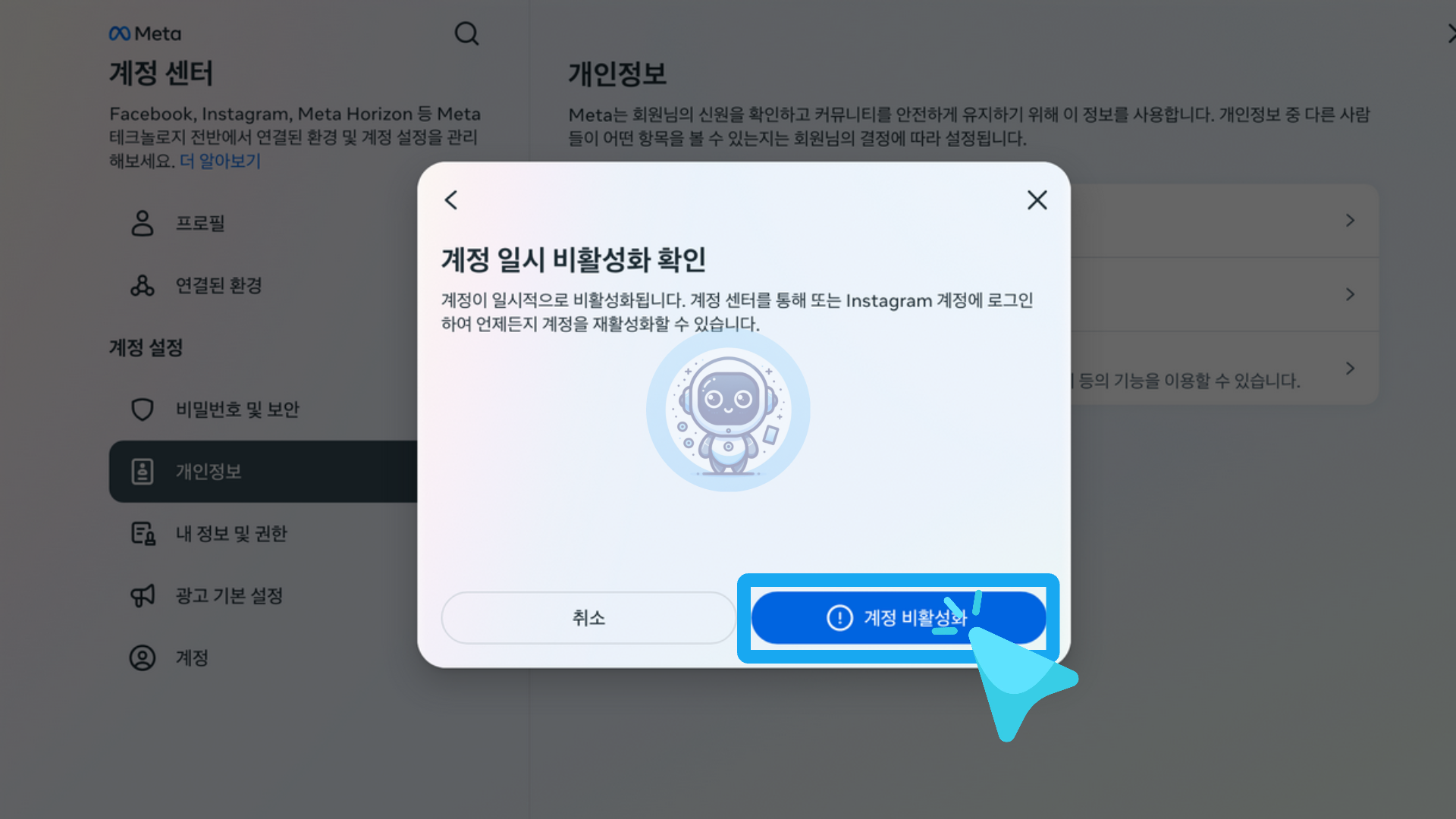 계정 일시 비활성화 확인 팝업창이 나타나면 [계정 비활성화] 버튼을 클릭하시면 인스타그램 계정 비활성화 과정이 완료됩니다.