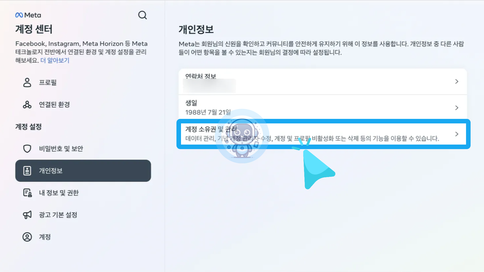 개인정보 화면에서 [계정 소유권 관리 - 데이터 관리, 기념 계정 관리자 수정, 계정 및 프로필 비활성화 또는 삭제 등의 기능을 이용할 수 있습니다.] 항목을 찾아 클릭합니다.