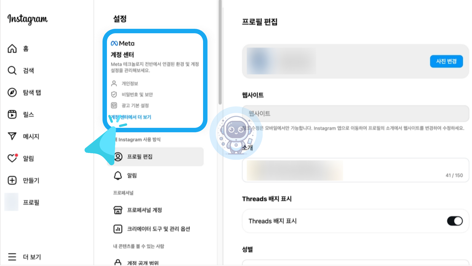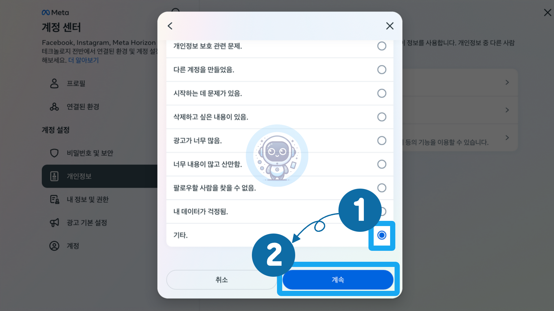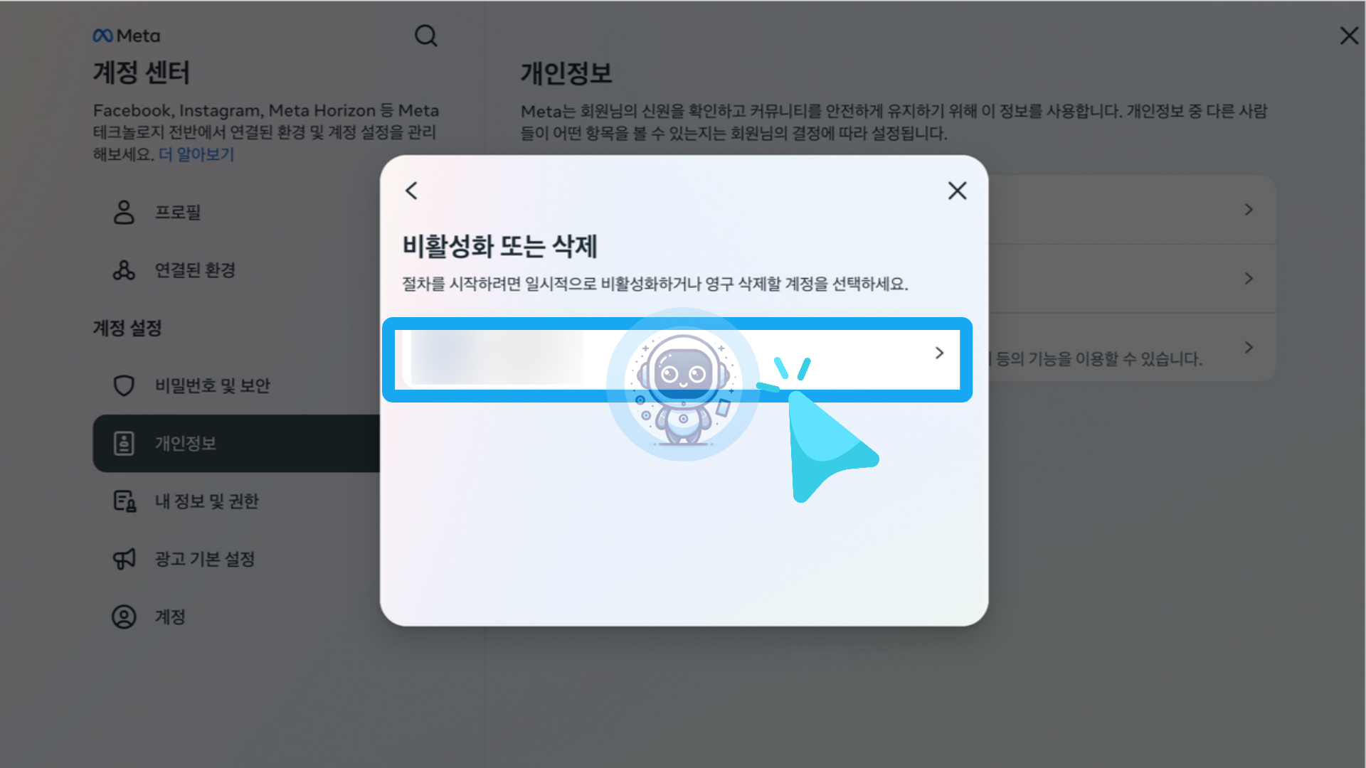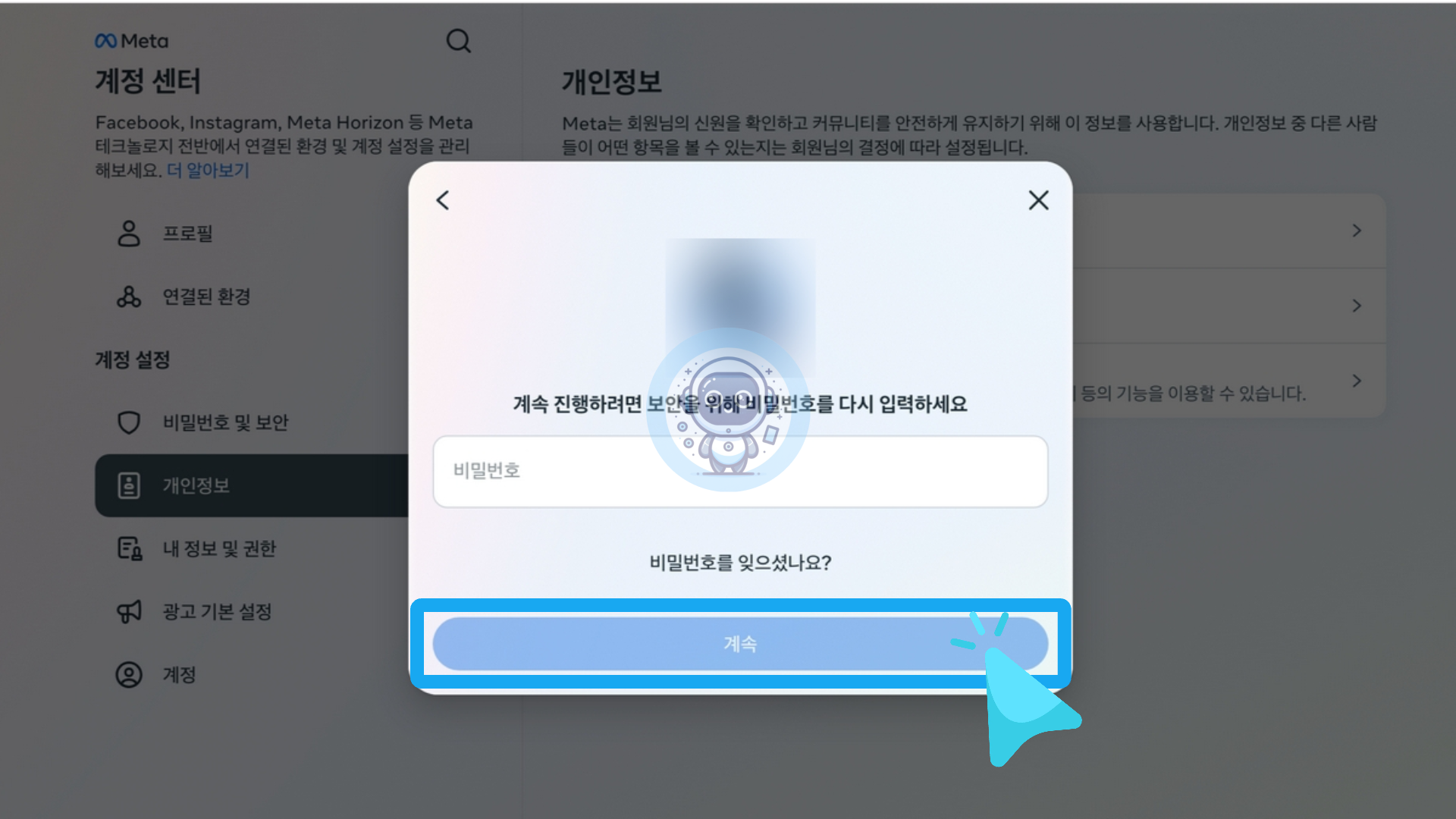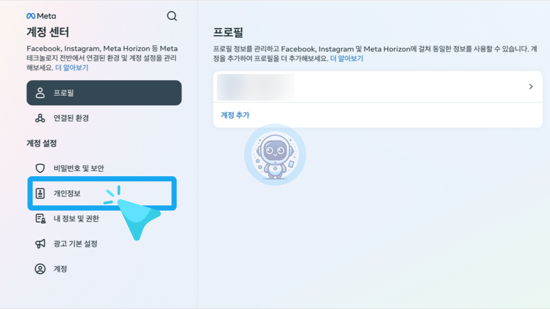 계정 센터 화면에서 좌측 사이드 바에 [개인정보]를 찾아 클릭합니다.