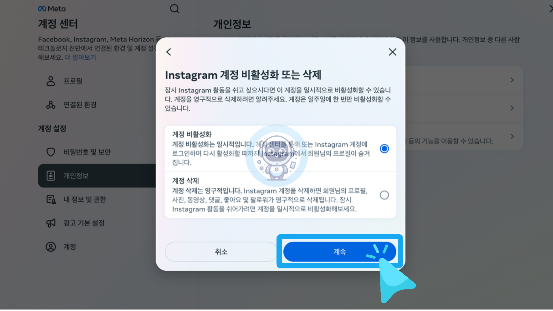 인스타 계정 비활성화 또는 삭제 선택 팝업창에서 [계정 비활성화]에 체크한 후 [계속] 버튼을 클릭합니다.