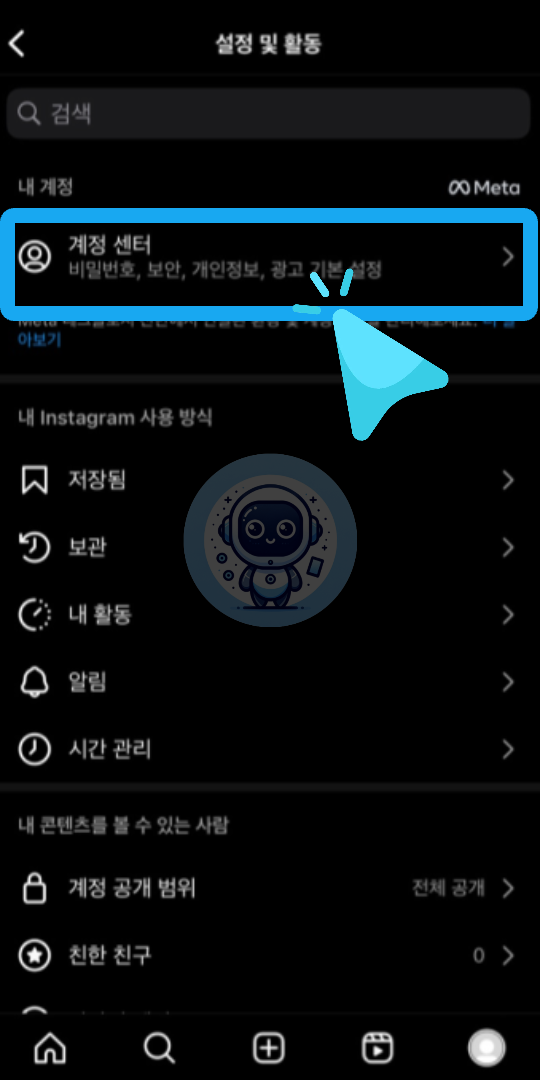 여러분 인스타그램 프로필 화면에서 오른쪽 상단의 메뉴(세 개의 줄)를 클릭하고 설정 및 활동 화면 상단에 있는 [계정 센터] 항목을 클릭합니다.