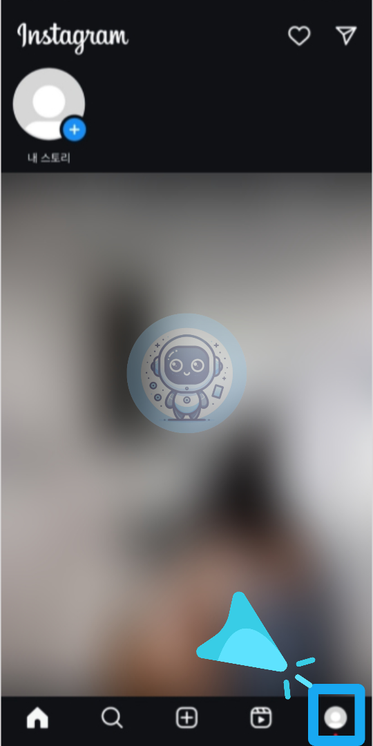 가장 먼저 여러분의 휴대폰에서 인스타그램 앱을 실행한 후, 화면 우측 하단에 있는 프로필 아이콘을 클릭합니다.