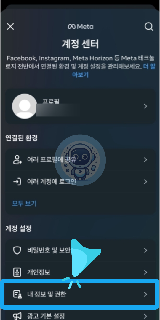 계정 센터에서 [내 정보 및 권한]을 클릭합니다. 그리고 '내 정보 및 권한' 화면에서 [내 정보 다운로드]를 클릭합니다.