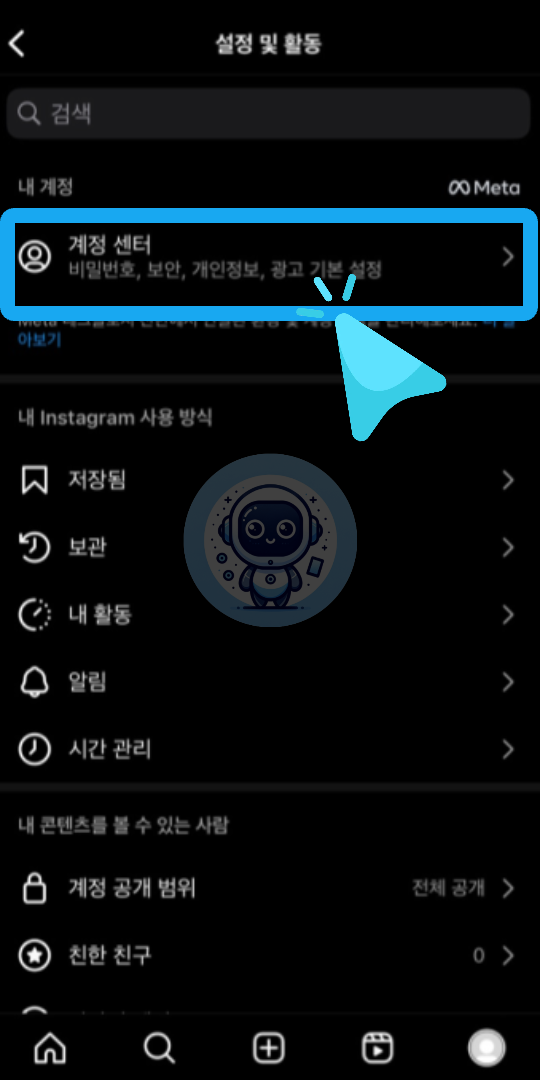 화면 상단에 있는 [세 줄 아이콘]을 클릭하여 설정 및 활동 화면으로 이동합니다. 여기서 '계정 센터'를 선택합니다.