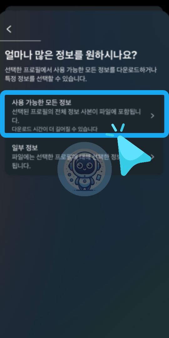 '내 정보 다운로드' 화면에서 [정보 다운로드 또는 전송]을 클릭합니다. 그러면 "얼마나 많은 정보를 원하시나요?"라는 질문과 함께 데이터를 선택할 수 있는 옵션이 나타납니다. 이곳에서 [사용 가능한 모든 정보]를 선택하면 모든 데이터를 다운로드할 수 있습니다.