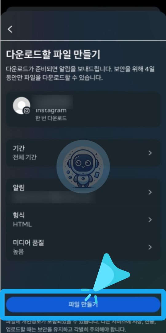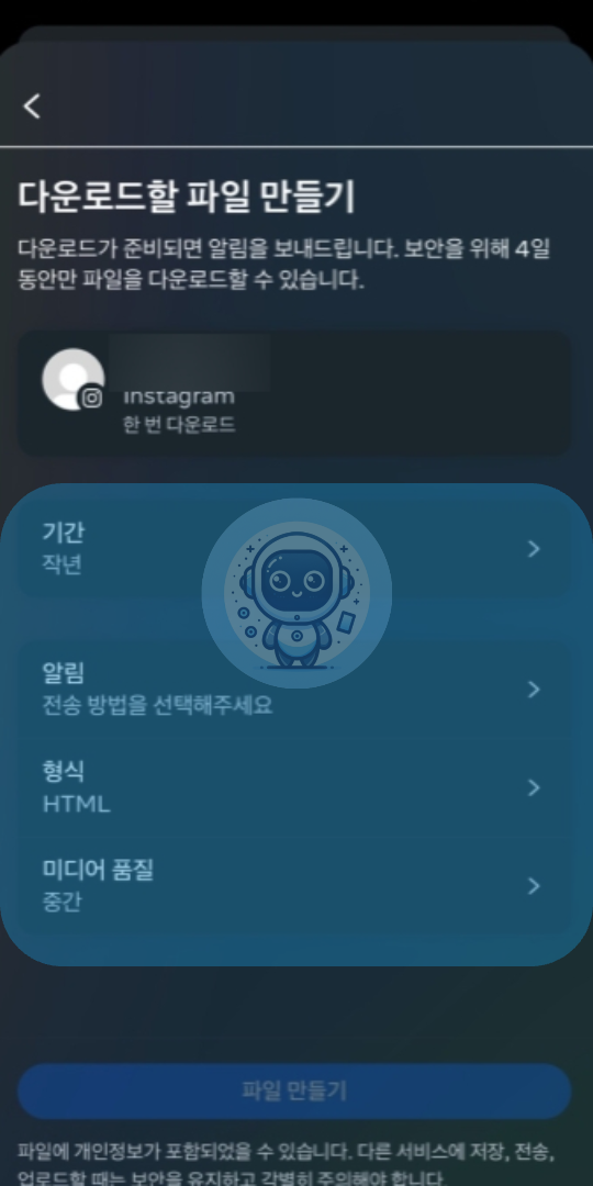 앞서 기간, 알림, 형식, 미디어 품질을 선택하셨다면, 하단에 있는 [파일 만들기] 버튼을 클릭하시면 여러분의 인스타그램 계정 데이터 다운로드가 시작됩니다.