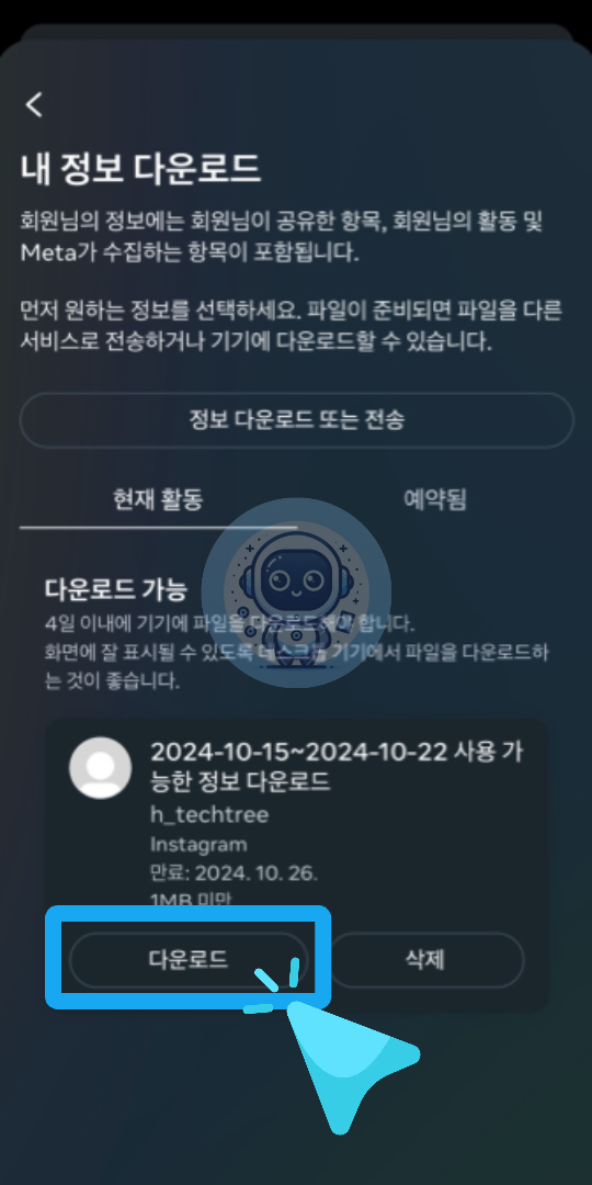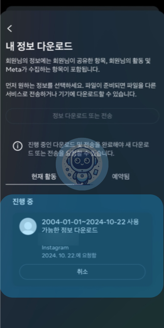 데이터 다운로드 요청은 완료된 후에는 취소할 수 없습니다. 하지만 요청된 데이터를 다운로드하지 않으면 서버에서 자동으로 삭제됩니다.