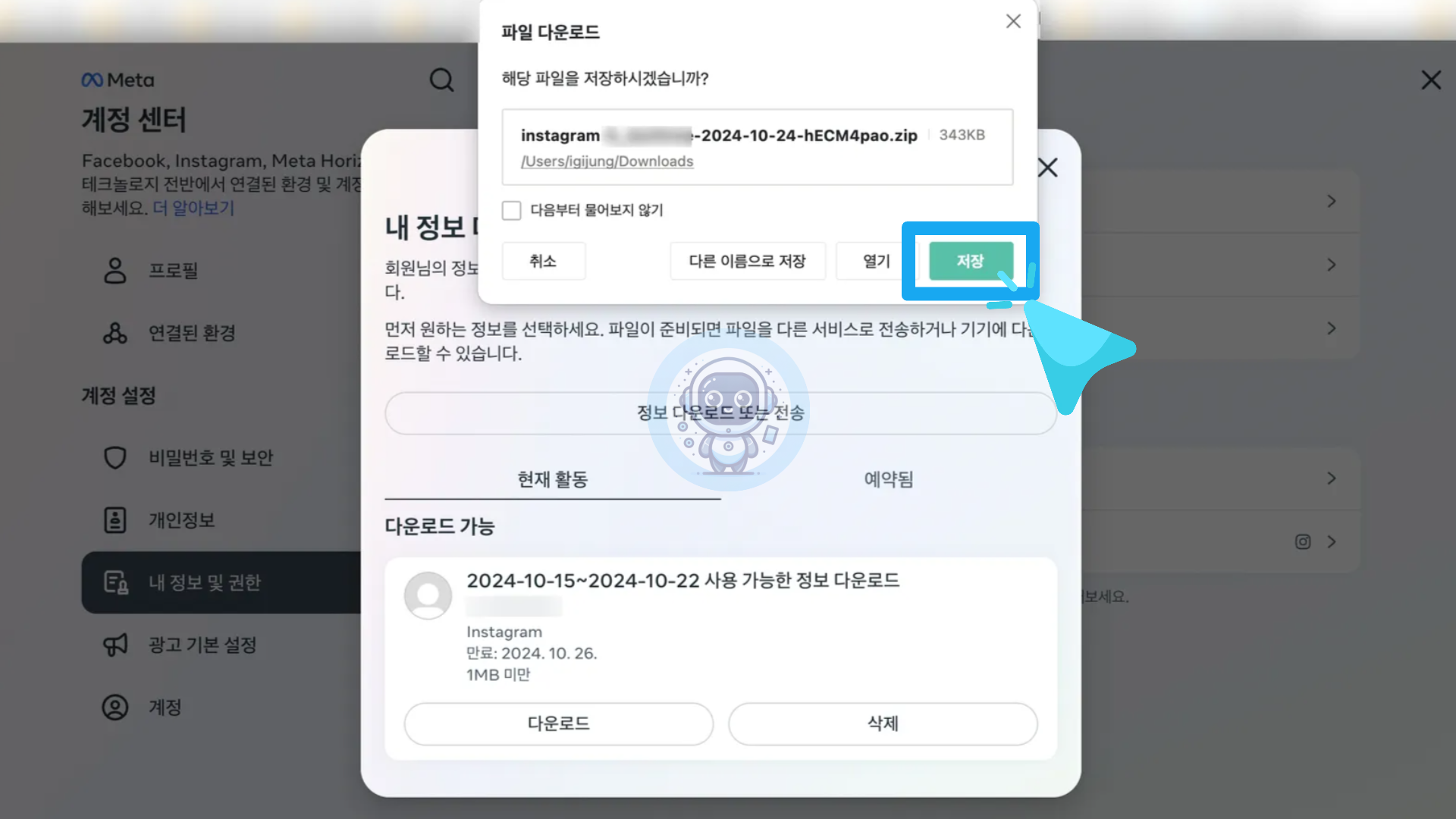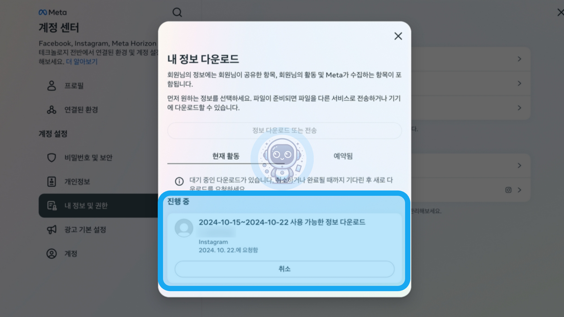 "내 정보 다운로드"라는 문구의 팝업창이 나타납니다. 현재 활동 하단에 여러분의 파일을 다운로드 받기 위해 진행 중입니다.