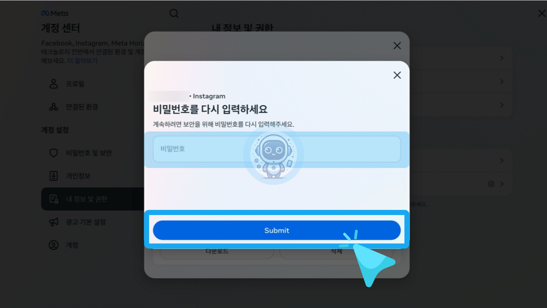 "비밀번호를 다시 입력하세요"라는 문구의 팝업창이 나타납니다. 여러분의 인스타그램 계정 비밀번호를 입력한 후 [Submit] 버튼을 클릭합니다.