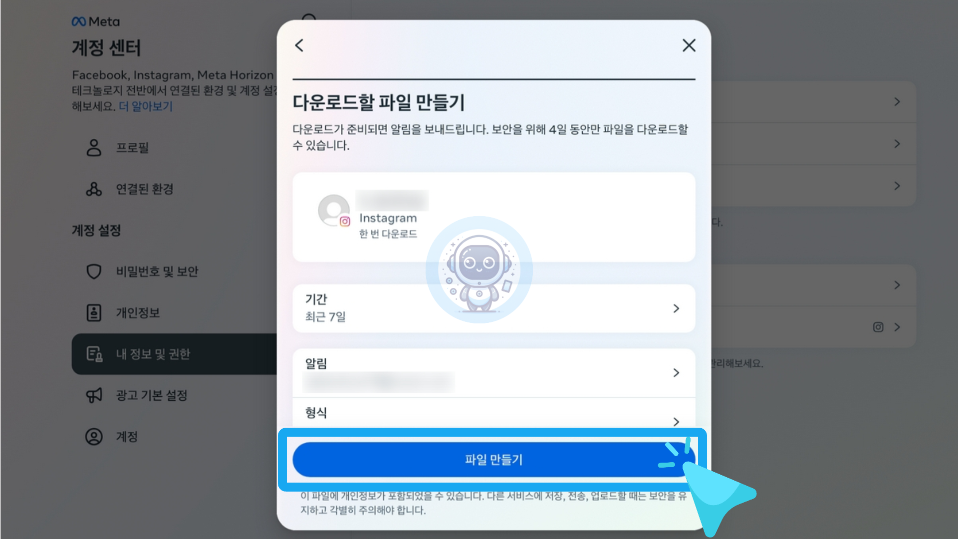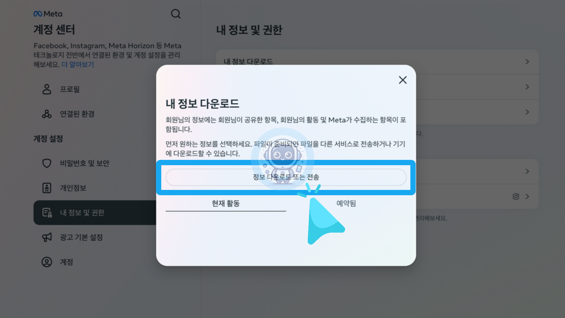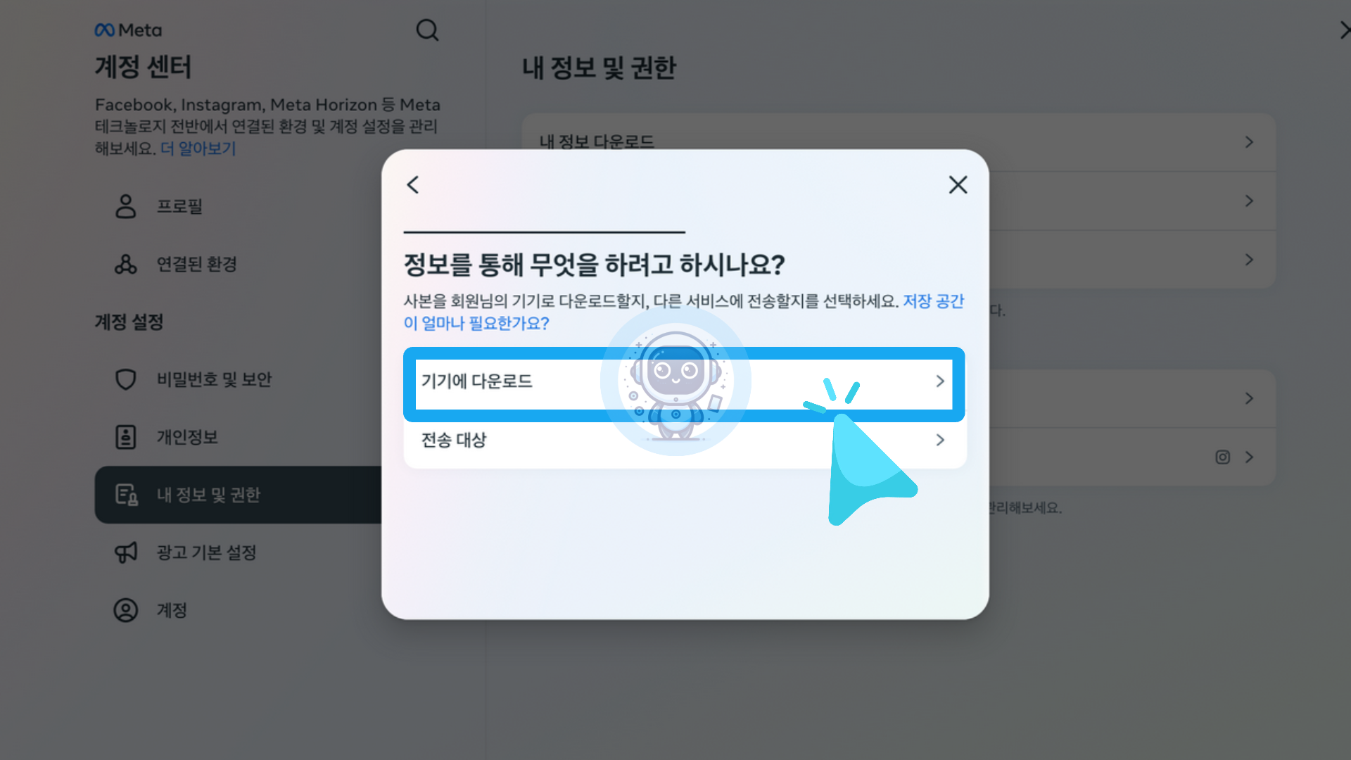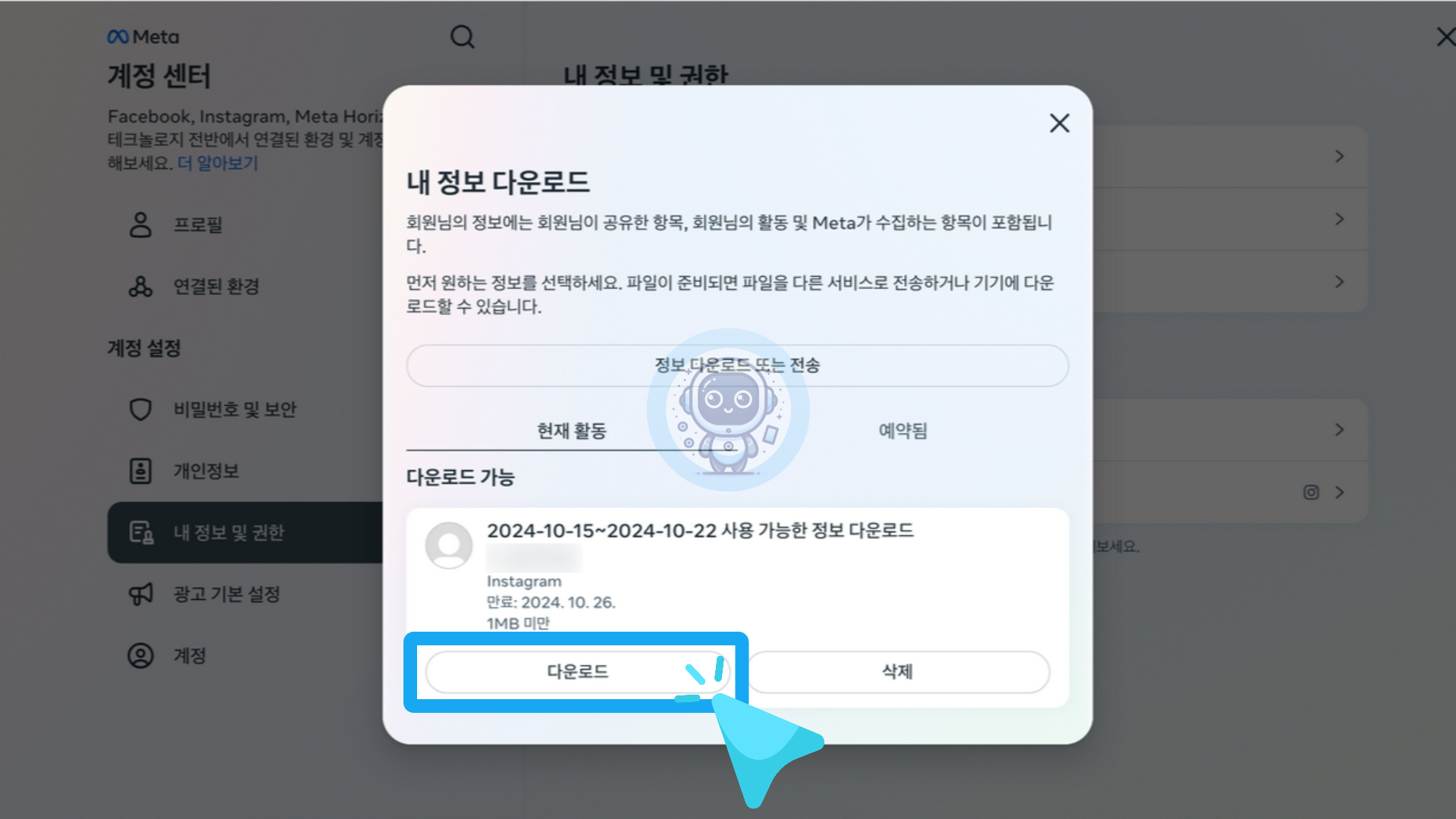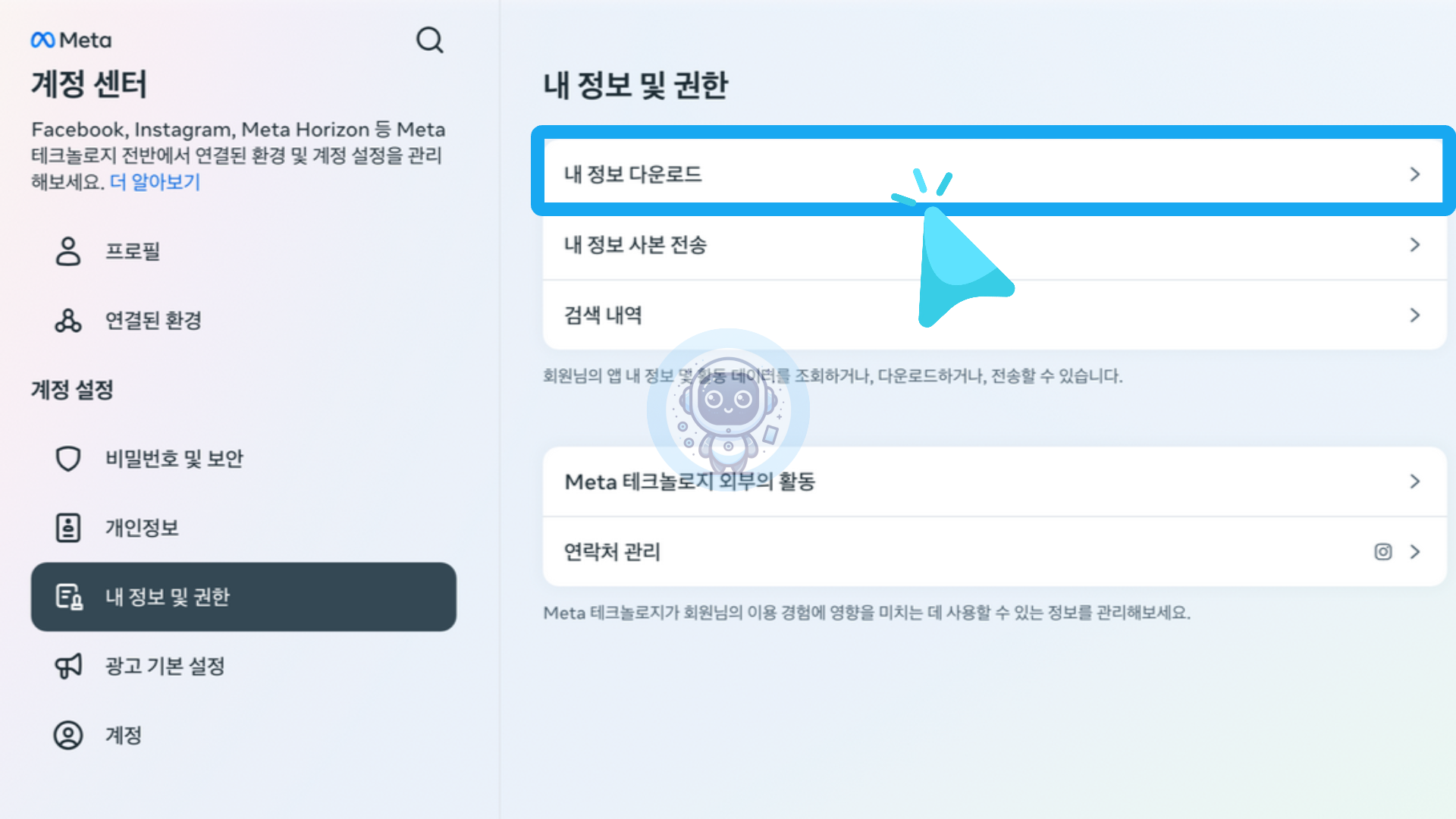 계정 센터 화면에서 내 정보 및 권한 항목을 클릭 후 [내 정보 다운로드]를 클릭합니다.