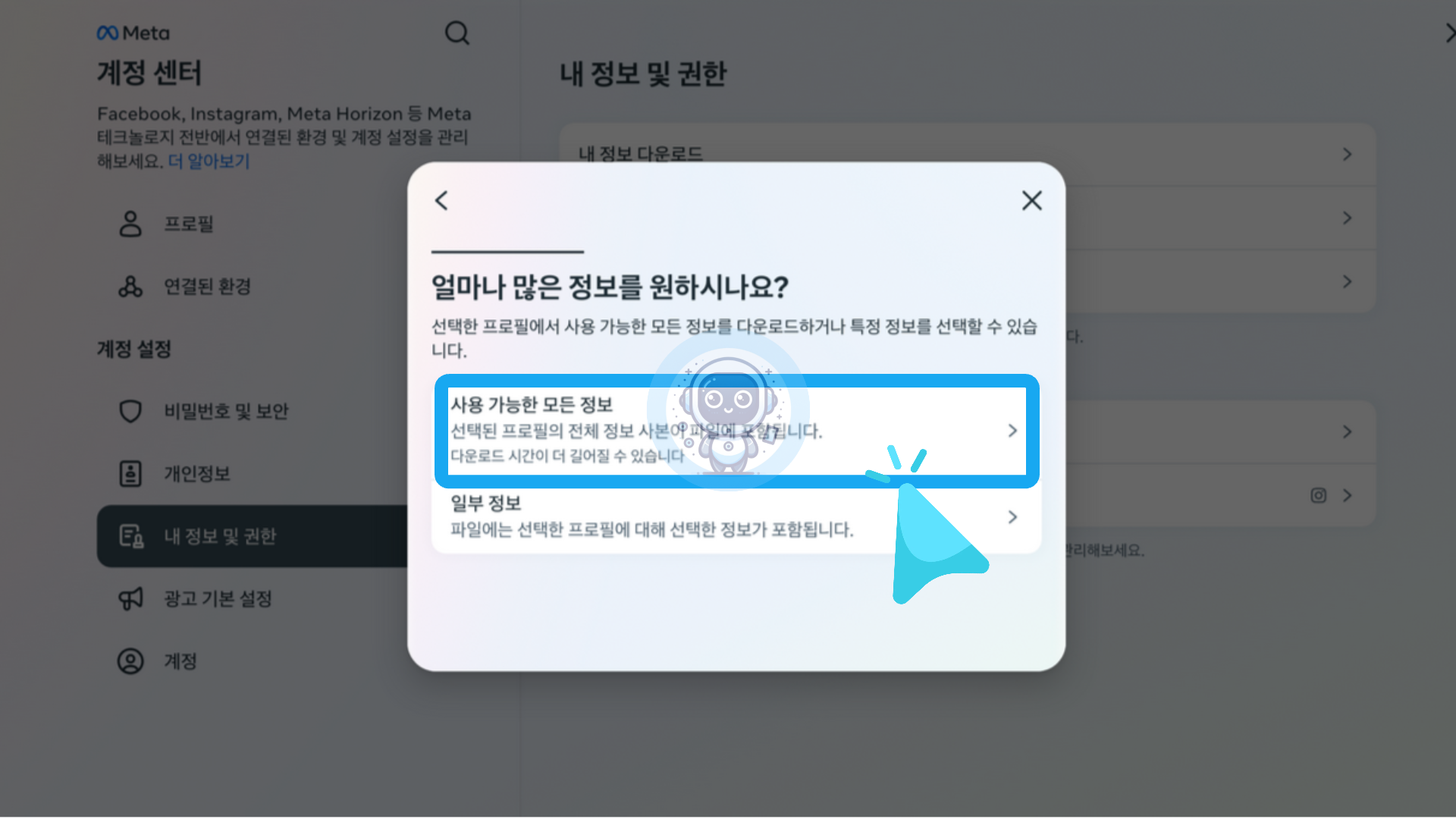 "얼마나 많은 정보를 원하시나요?"라는 문구가 적힌 팝업창이 나타납니다. 여기서 선택한 프로필에서 사용 가능한 모든 정보를 다운로드하거나 특정 정보를 선택할 수 있습니다. 저는 모든 데이터를 저장하기 위해 [사용 가능한 모든 정보]를 클릭합니다.