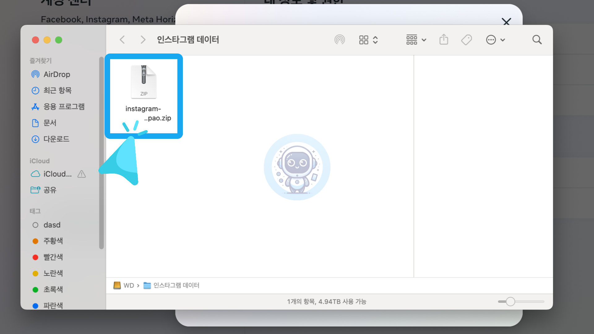 다운로드한 zip 파일은 여러분이 지정한 위치에 저장됩니다. 이 파일에는 모든 사진, 비디오, 댓글, 메시지 등이 포함되어 있습니다.