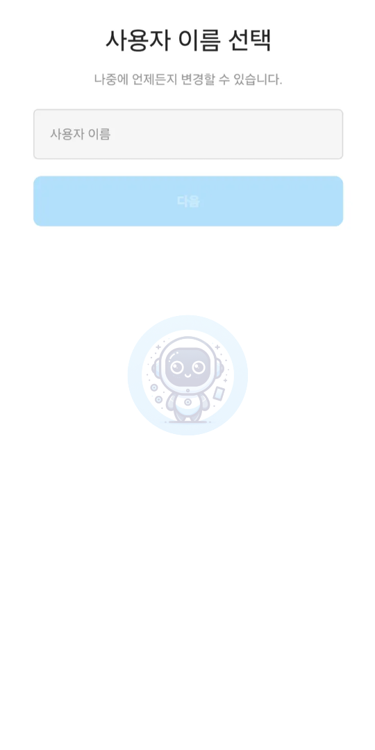 '새 계정 만들기'버튼을 클릭한 후 사용자 이름을 입력합니다. 사용 중이지 않은 이름일 경우 초록색 체크 표시가 나타나며, ‘다음’을 눌러 다음 단계로 넘어갑니다.
