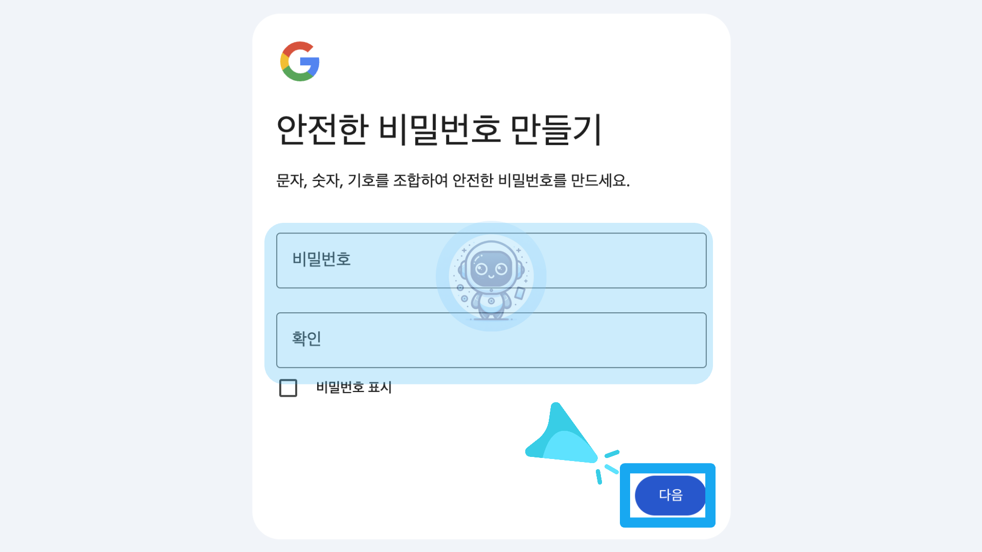 안전한 비밀번호 만들기 화며에서 비밀번호를 입력합니다. 비밀번호는 문자, 숫자, 기호를 조합해 8자 이상으로 설정합니다. 입력이 완료되면 [다음] 버튼을 클릭합니다.
