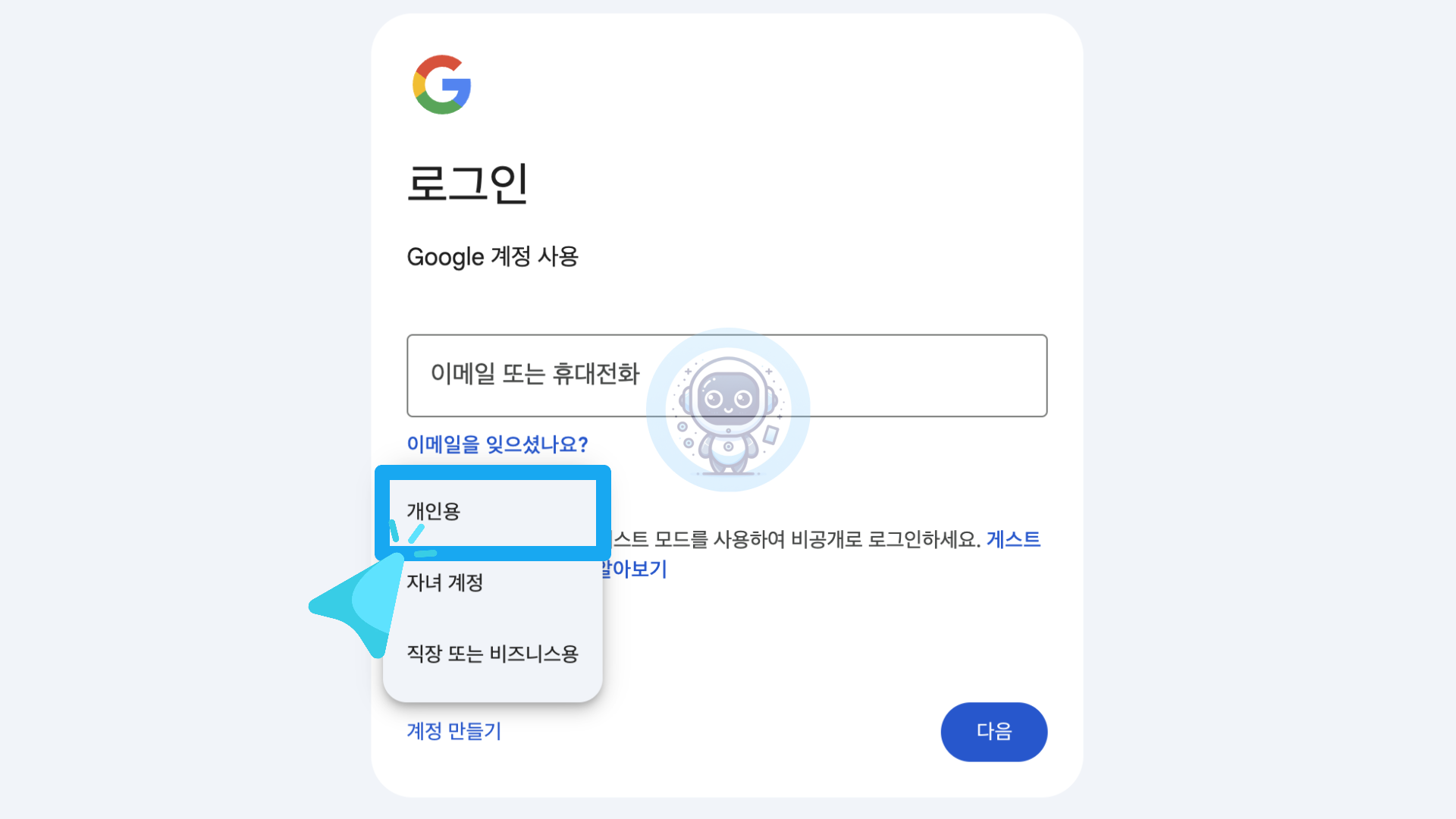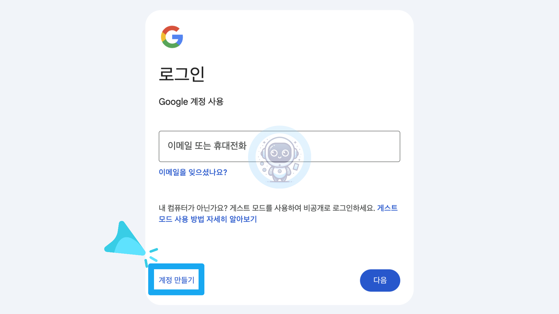 구글 로그인 화면에서 [계정 만들기] 버튼을 클릭합니다.