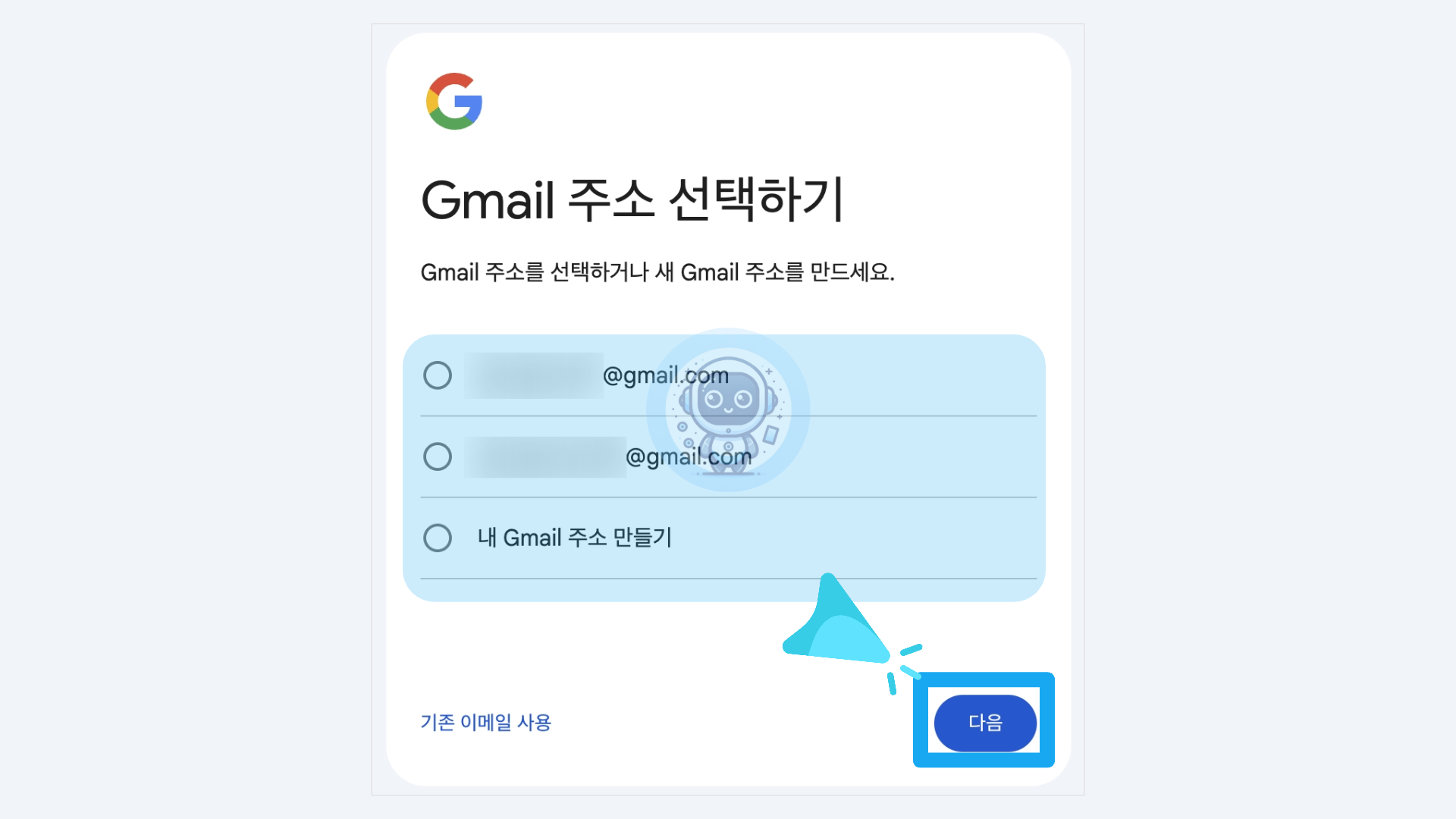 지메일 주소 선택하기 화면에서 여러분이 사용할 지메일 주소를 만든 후 [다음] 버튼을 클릭합니다.