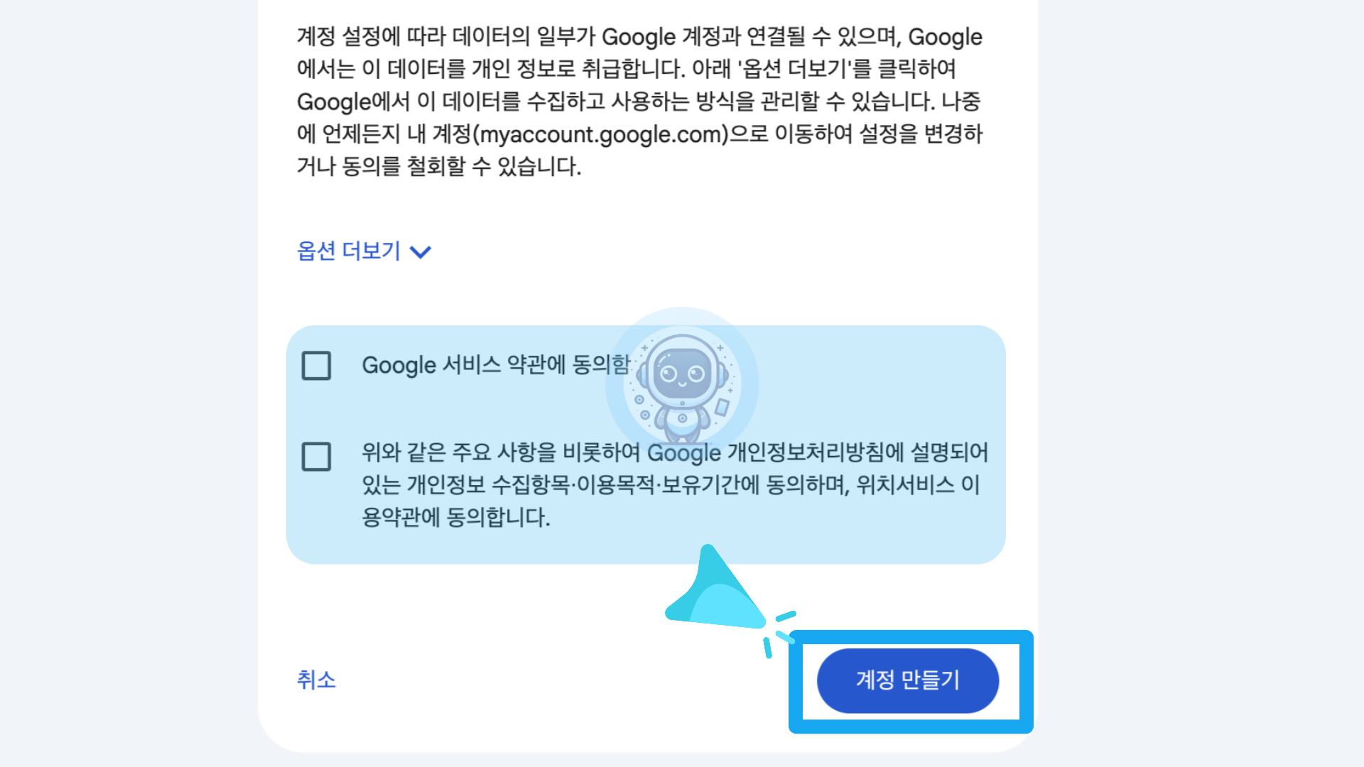 개인 정보 보호 및 약관을 모두 읽고 확인한 후, 구글 서비스 약관에 동의함 및 개인정보 처리 방침 체크 박스에 체크한 다음, [계정 만들기] 버튼을 클릭하세요. 이렇게 하면 구글 계정 생성이 완료됩니다.