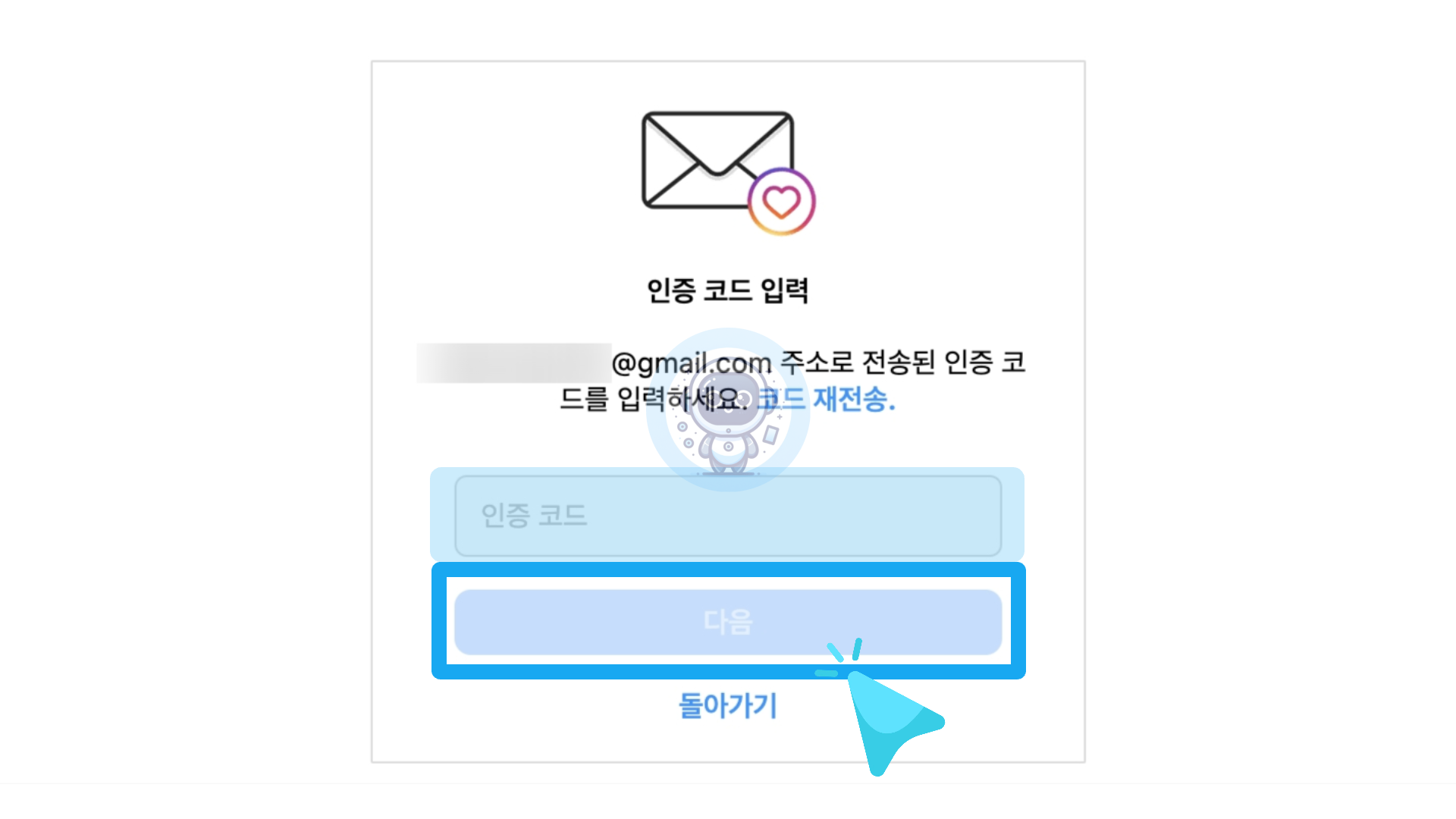 앞서 개인정보 입력 화면에서 입력한 전화번호 또는 이메일로 인증 코드가 발송됩니다. 해당 인증 코드를 확인한 후 입력하고, [다음] 버튼을 클릭하세요. 이 과정을 통해 계정 인증이 완료됩니다!